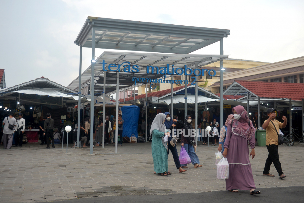 Wisatawan usai berbelanja cenderamata di Teras Malioboro 2, Yogyakarta, Kamis (26/5/2022). Libur nasional membawa berkah bagi pedagang cenderamata di Teras Malioboro 2. Sejak menjelang siang wisatawan mulai ramai untuk membeli Anke cenderamata khas Yogyak | Wihdan Hidayat / Republika
