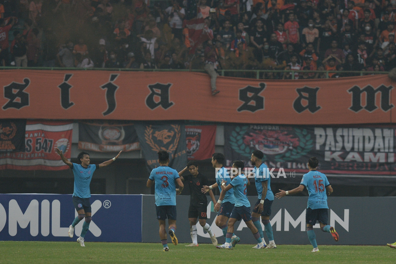 Pemain Sabah FC melakukan selebrasi seusai mencetak gol ke gawang Persija Jakarta saat pertandingan persahabatan di Stadion Patriot Chandrabhaga, Bekasi, Jawa Barat, Ahad (5/6/2022). Pertandingan berakhir dengan skor 2-1 untuk kemenangan Sabah FC. | Republika/Edwin Dwi Putranto