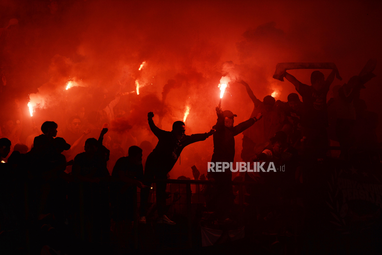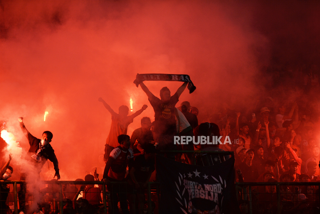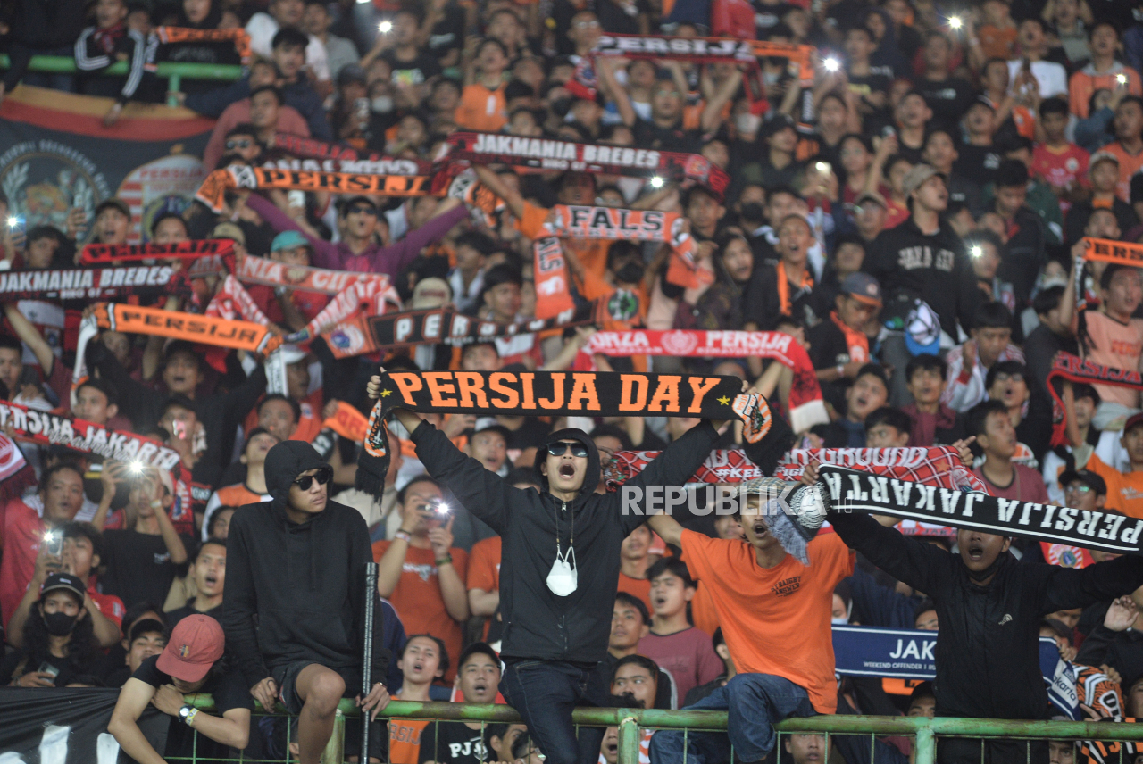 Suporter Persija saat menyaksikan pertandingan persahabatan antara Persija Jakarta melawan Sabah FC di Stadion Patriot Chandrabhaga, Bekasi, Jawa Barat, Ahad (5/6/2022). Pertandingan berakhir dengan skor 2-1 untuk kemenangan Sabah FC. | Republika/Edwin Dwi Putranto