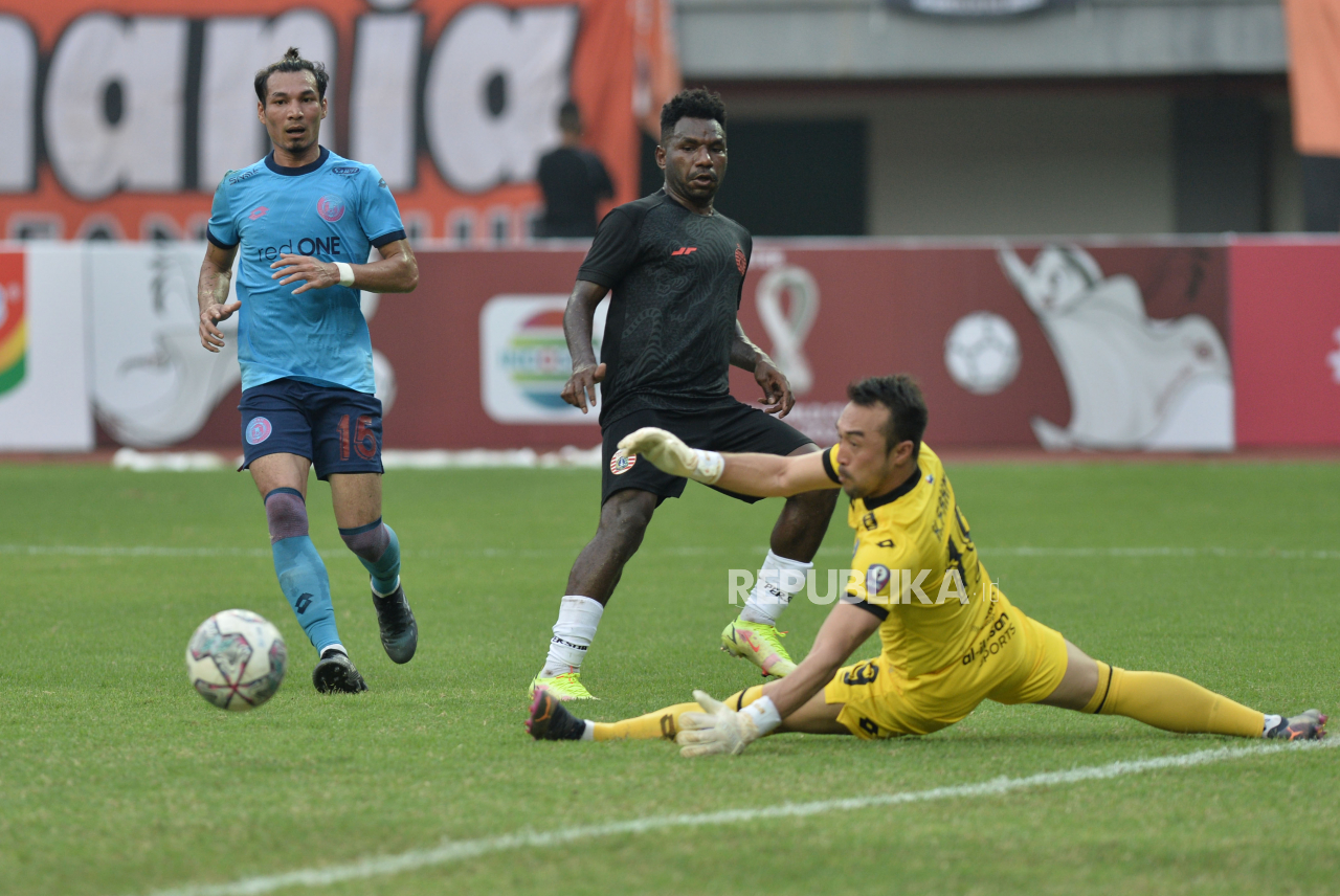 Penyerang Persija Jakarta Ricky Ricardo Cristian Cawor (hitam) mengecoh penjaga gawang Sabah FC Khairul Fahmi saat pertandingan persahabatan di Stadion Patriot Chandrabhaga, Bekasi, Jawa Barat, Ahad (5/6/2022). Pertandingan berakhir dengan skor 2-1 untuk | Republika/Edwin Dwi Putranto