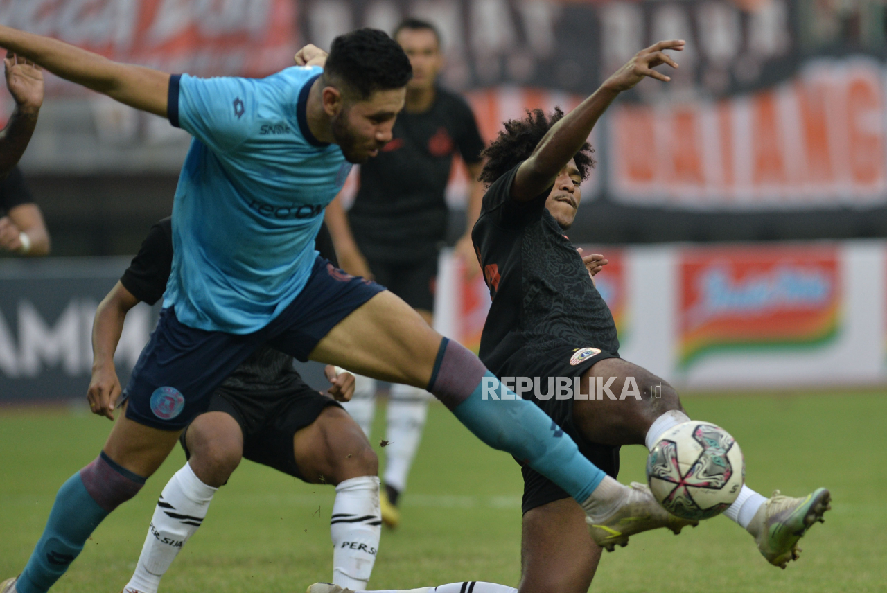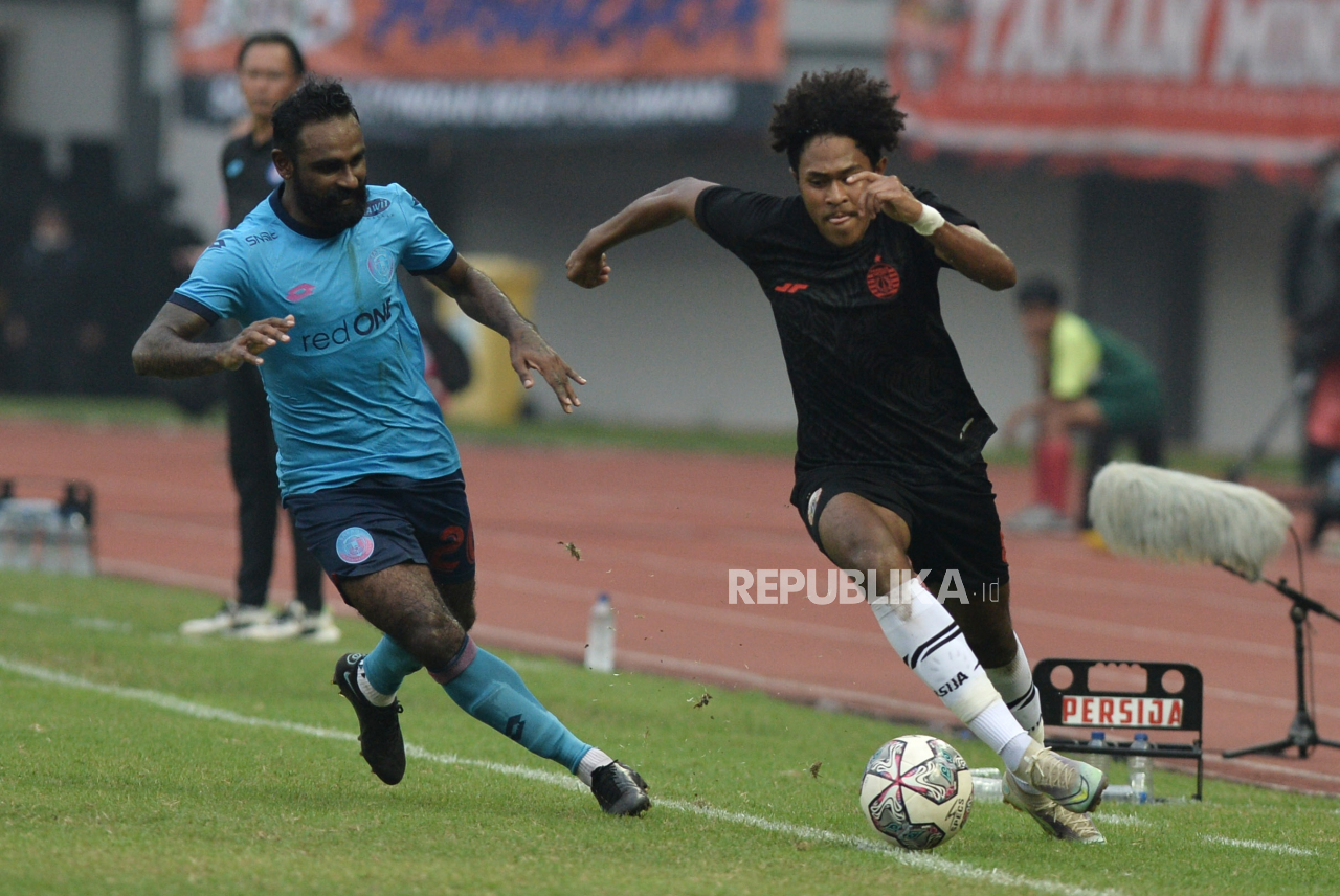 Gelandang Persija Jakarta Braif Fatari (hitam) berebut bola saat pertandingan persahabatan melawan Sabah FC di Stadion Patriot Chandrabhaga, Bekasi, Jawa Barat, Ahad (5/6/2022). Pertandingan berakhir dengan skor 2-1 untuk kemenangan Sabah FC. | Republika/Edwin Dwi Putranto