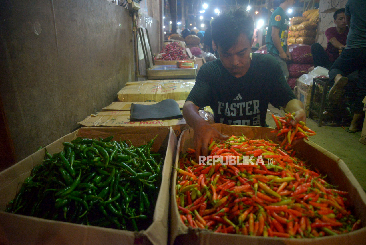 Pedagang menata cabai dagangannya di ke Pasar Induk Kemang (TU) Bogor, Jawa Barat, Senin (20/6/2022). Harga jual beberapa jenis cabai di pasar induk tersebut masih relatif tinggi seperti cabai rawit merah yakni berkisar Rp85.000-Rp90.000 per kilogram dan | Prayogi/Republika.