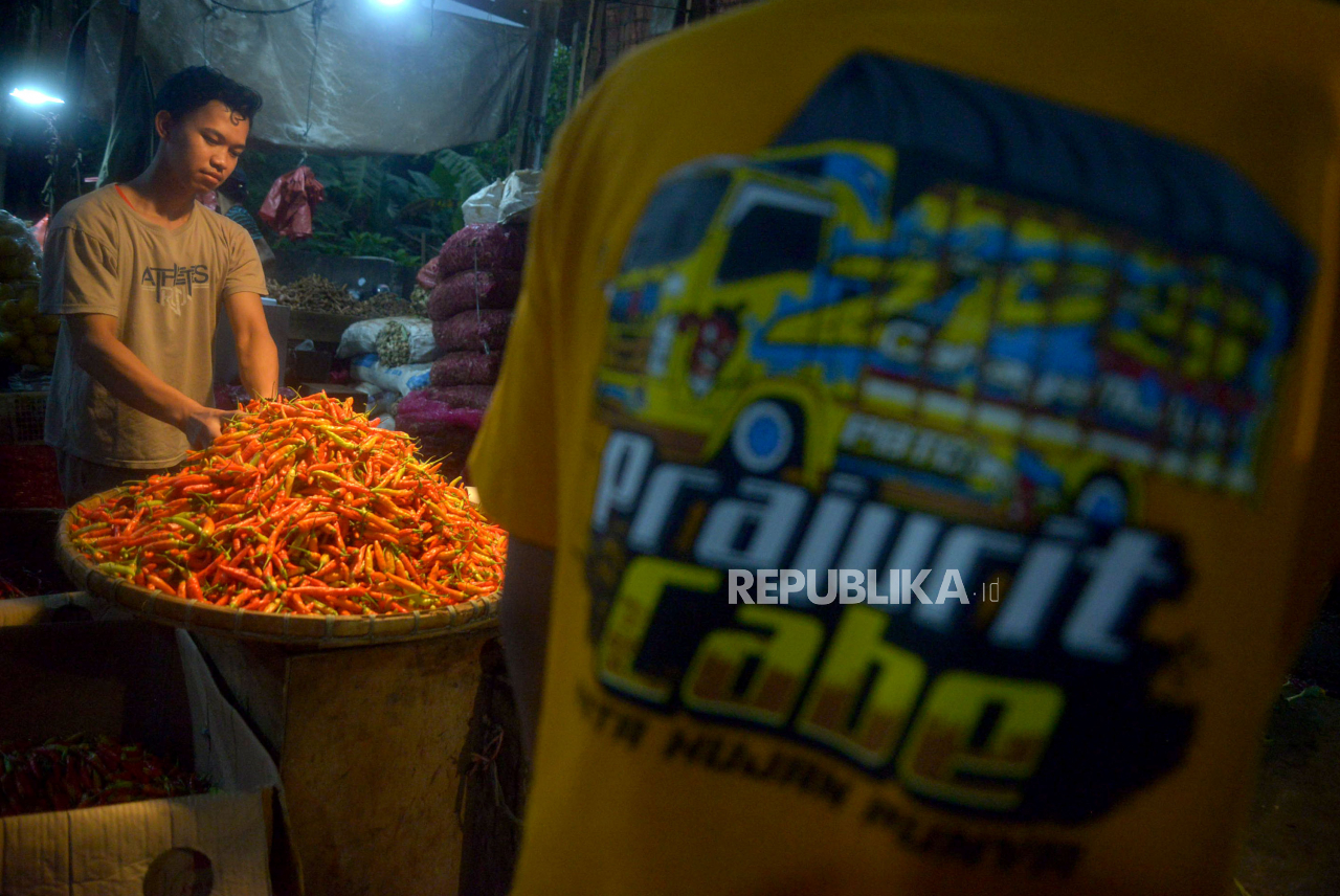 Pedagang menata cabai dagangannya di Pasar Induk Kemang (TU) Bogor, Jawa Barat, Senin (20/6/2022). Harga jual beberapa jenis cabai di pasar induk tersebut masih relatif tinggi seperti cabai rawit merah yakni berkisar Rp85.000-Rp90.000 per kilogram dan cab | Prayogi/Republika.