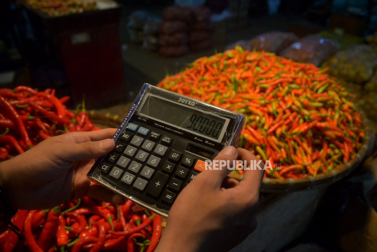Pedagang menghitung harga jual cabai dagangannya di Pasar Induk Kemang (TU) Bogor, Jawa Barat, Senin (20/6/2022). Harga jual beberapa jenis cabai di pasar induk tersebut masih relatif tinggi seperti cabai rawit merah yakni berkisar Rp85.000-Rp90.000 per k | Prayogi/Republika.