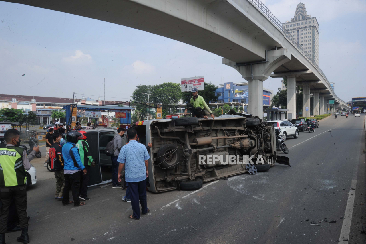 Kendaraan Travel Jurusan Bandung Jakarta mengalami kecelakaan tunggal di Jl MT Haryono, Selasa (21/6/2022). Kecelakaan diduga akibat supir mengantuk menabrak sisi kanan jalan yang membawa 4 penumpang. Kejadiaan ini tidak menyebabkan korban Jiwa namun dua telepon genggam penumpang hilang. Foto: Tahta Aidilla/Republika