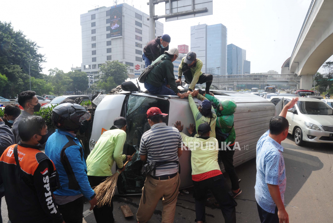 Penunpang dievakuasi oleh pengendaraa motor saat kendaraan travel Jurusan Bandung Jakarta mengalami kecelakaan tunggal di Jl MT Haryono, Selasa (21/6/2022). Kecelakaan diduga akibat supir mengantuk menabrak sisi kanan jalan yang membawa 4 penumpang. Kejad | Tahta Aidilla/Republika