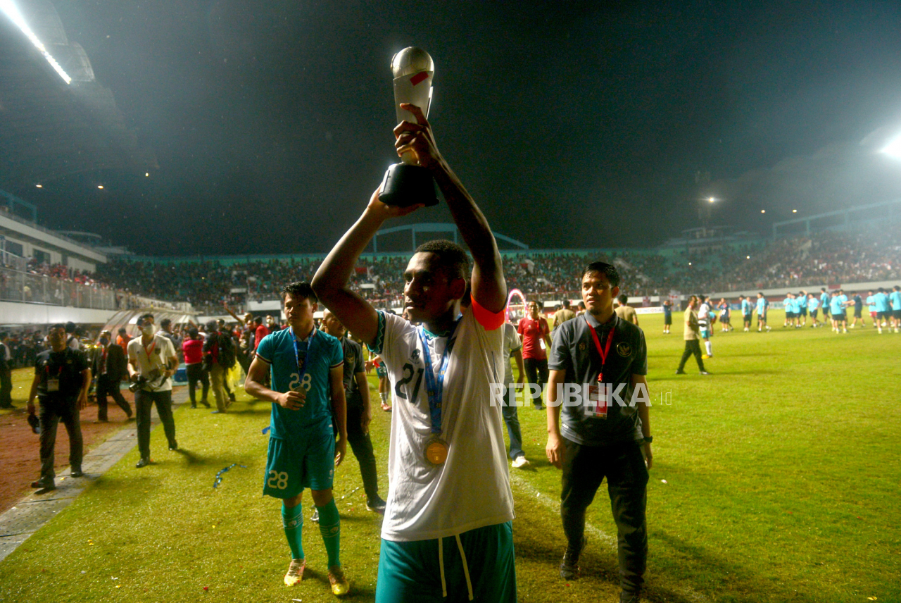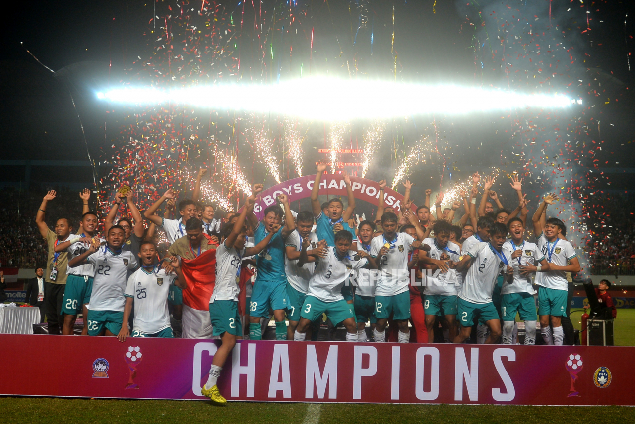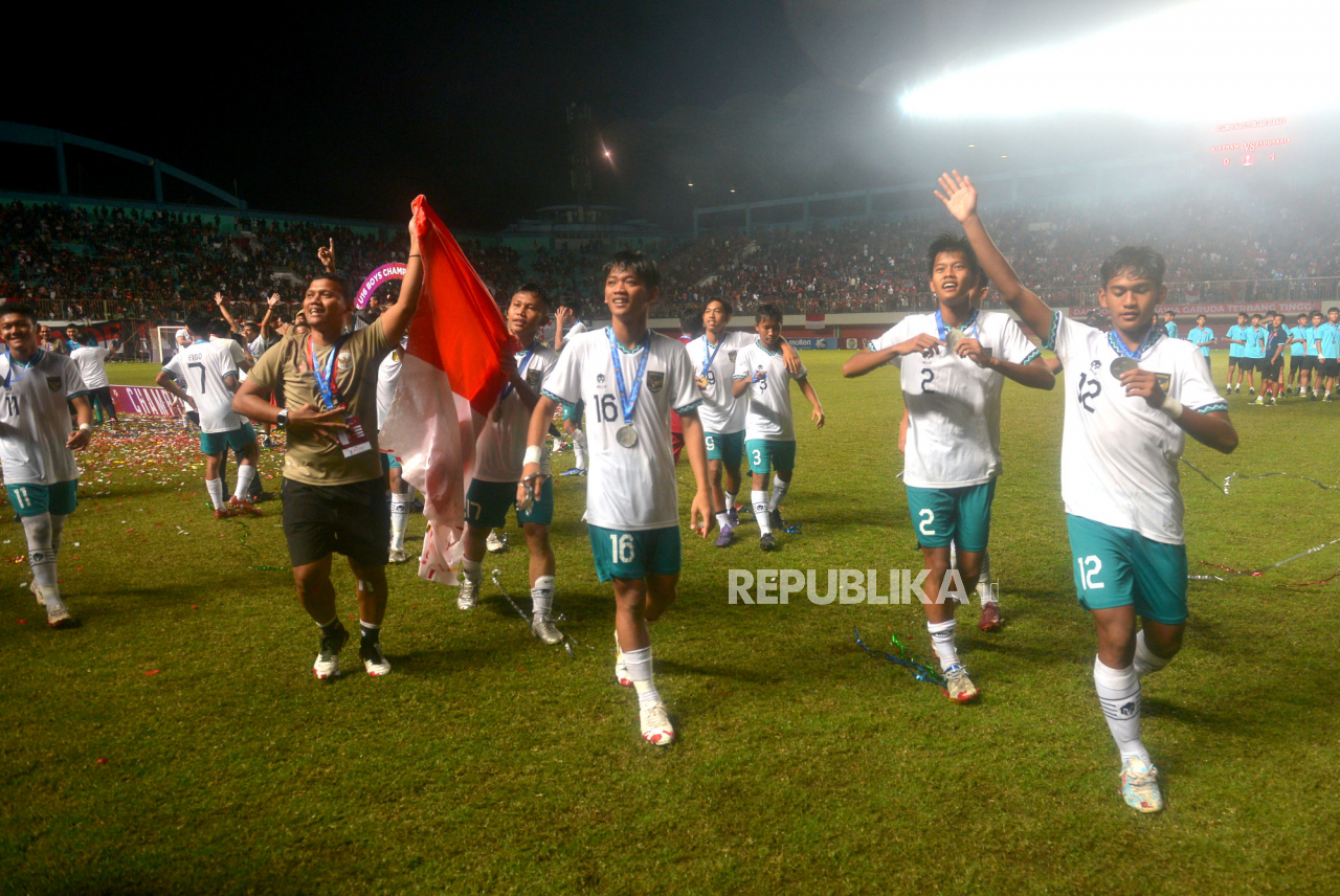 Pemain dan official Timnas Indonesia U16 melakukan selebrasi usai seremoni penyerahan Piala AFF U16 Putra di Stadion Maguwoharjo, Sleman, Yogyakarta, Jumat (12/8/2022). Para pertandingan Final AFF U16 Putra 2022 Indonesia mengalahkan Vietnam 1-0. Republik | Republika/Wihdan Hidayat