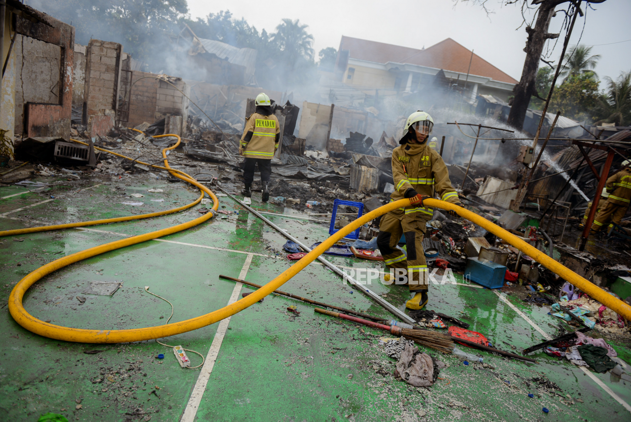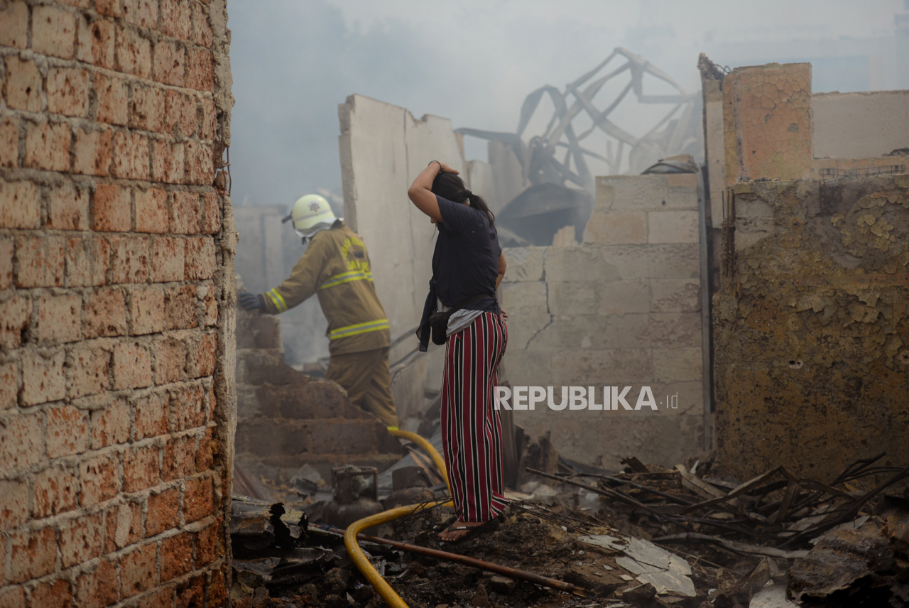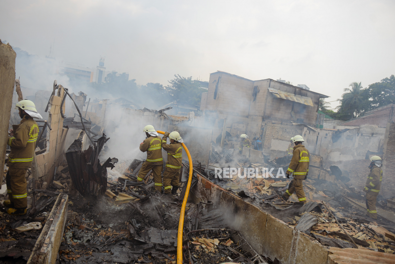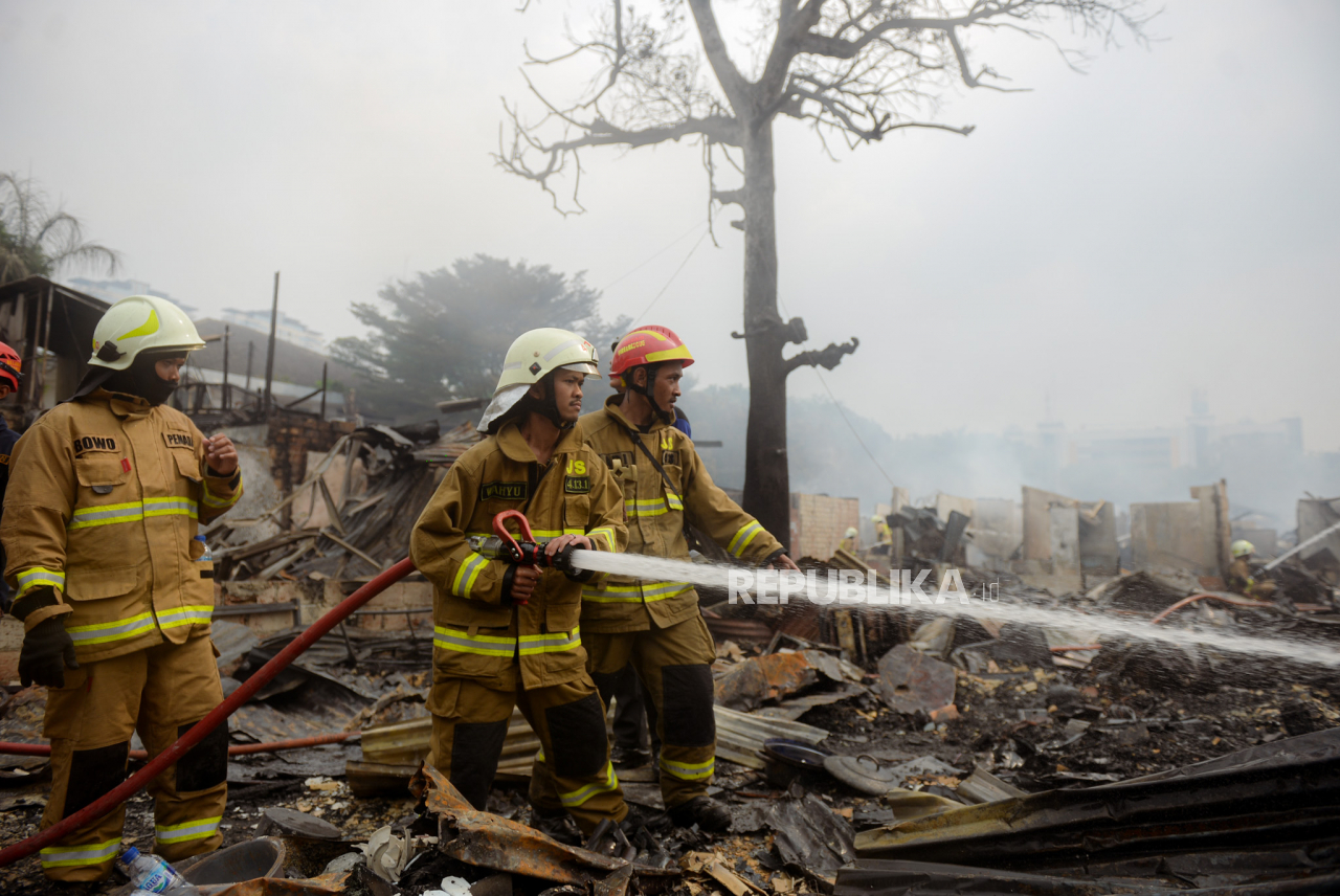 Proses pendinginan di lokasi kebakaran pemukiman di kawasan Simprug Golf II, Kebayoran Lama, Jakarta Selatan, Ahad (21/8/2022). Kebakaran tersebut terjadi sekitar pukul 10.48 WIB yang diduga akibat korsleting listrik di salah satu kontrakan di kawasan tersebut. Sementara menurut Kepala Seksi Operasi Suku Dinas Penanggulangan Kebakaran dan Penyelamatan Jakarta Selatan, sekitar 100 rumah ludes terbakar dalam kejadian tersebut. Republika/Thoudy Badai Baca Selengkapnya';