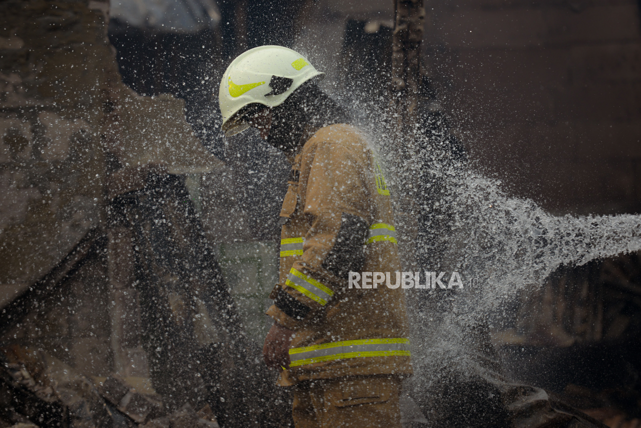 Petugas Penanggulangan Kebakaran dan Penyelamatan (Gulkarmat) melakukan proses pendinginan di lokasi kebakaran pemukiman di kawasan Simprug Golf II, Kebayoran Lama, Jakarta Selatan, Ahad (21/8/2022). Kebakaran tersebut terjadi sekitar pukul 10.48 WIB yang | Republika/Thoudy Badai