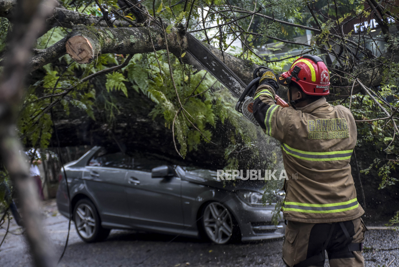 Petugas memotong batang pohon yang tumbang di Jalan Maulana Yusuf, Bandung Wetan, Kota Bandung, Rabu (5/10/2022). Hujan deras yang disertai angin kencang mengakibatkan sejumlah pohon yang ada di kawasan tersebut tumbang menimpa halaman rumah warga serta satu unit mobil mewah dan menutup akses jalan. Republika/Abdan Syakura