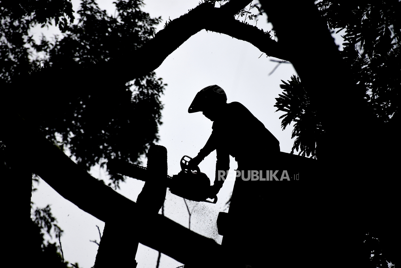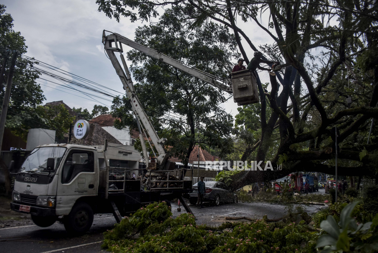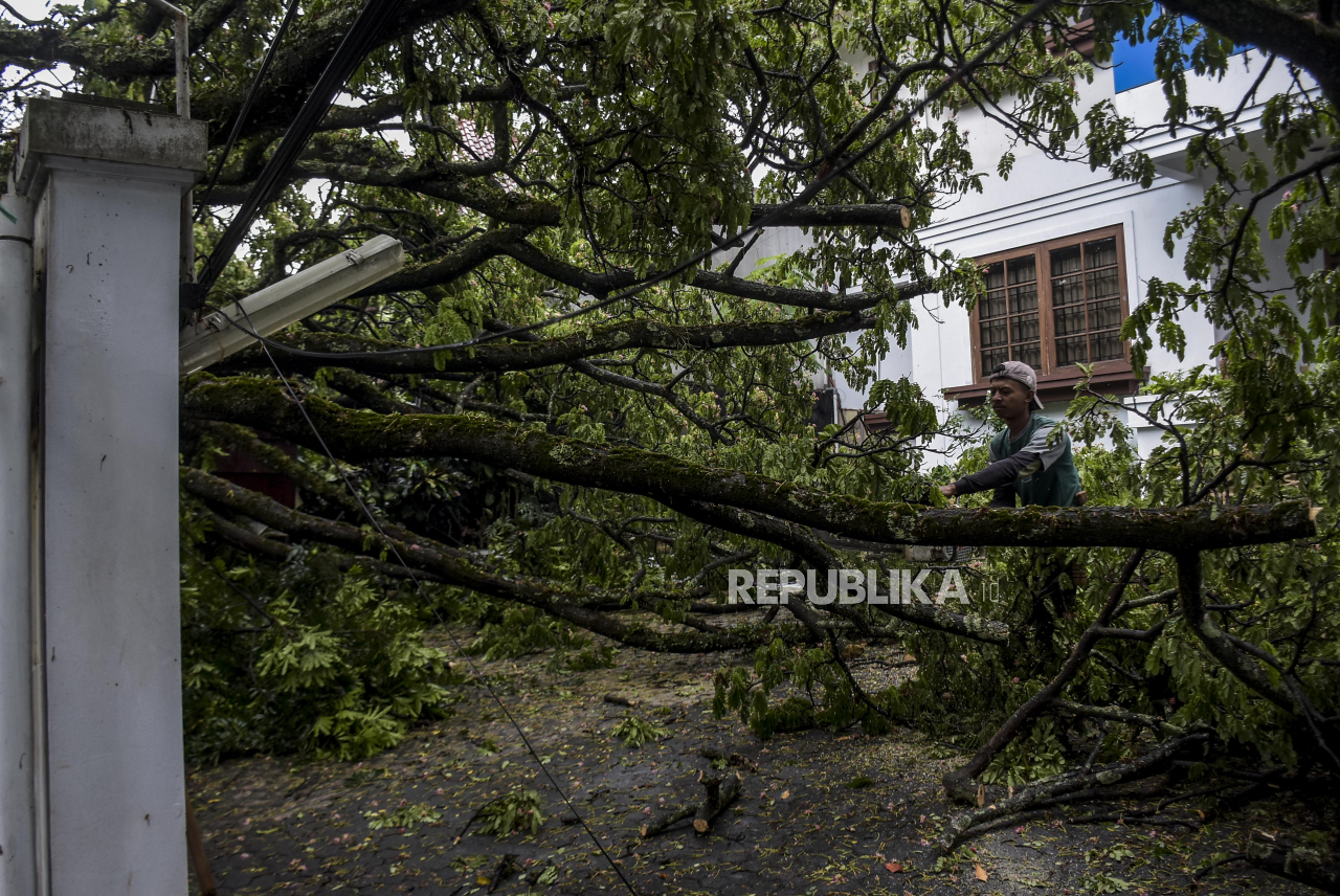 Petugas memotong batang pohon yang tumbang di Jalan Maulana Yusuf, Bandung Wetan, Kota Bandung, Rabu (5/10/2022). Hujan deras yang disertai angin kencang mengakibatkan sejumlah pohon yang ada di kawasan tersebut tumbang menimpa halaman rumah warga serta s | REPUBLIKA/ABDAN SYAKURA