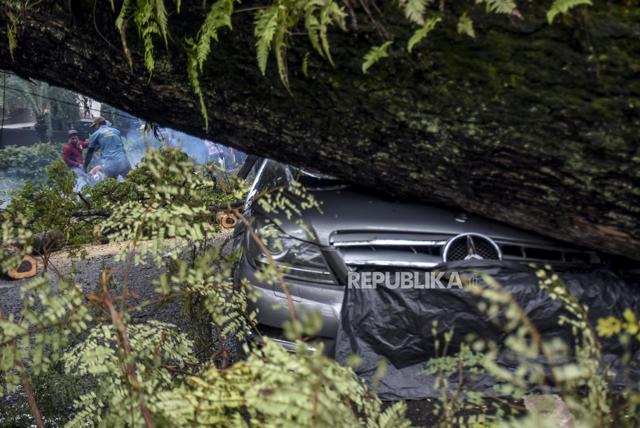 Warga mengambil gambar mobil mewah yang tertimpa pohon tumbang di Jalan Maulana Yusuf, Bandung Wetan, Kota Bandung, Rabu (5/10/2022). Hujan deras yang disertai angin kencang mengakibatkan sejumlah pohon yang ada di kawasan tersebut tumbang menimpa halaman | REPUBLIKA/ABDAN SYAKURA