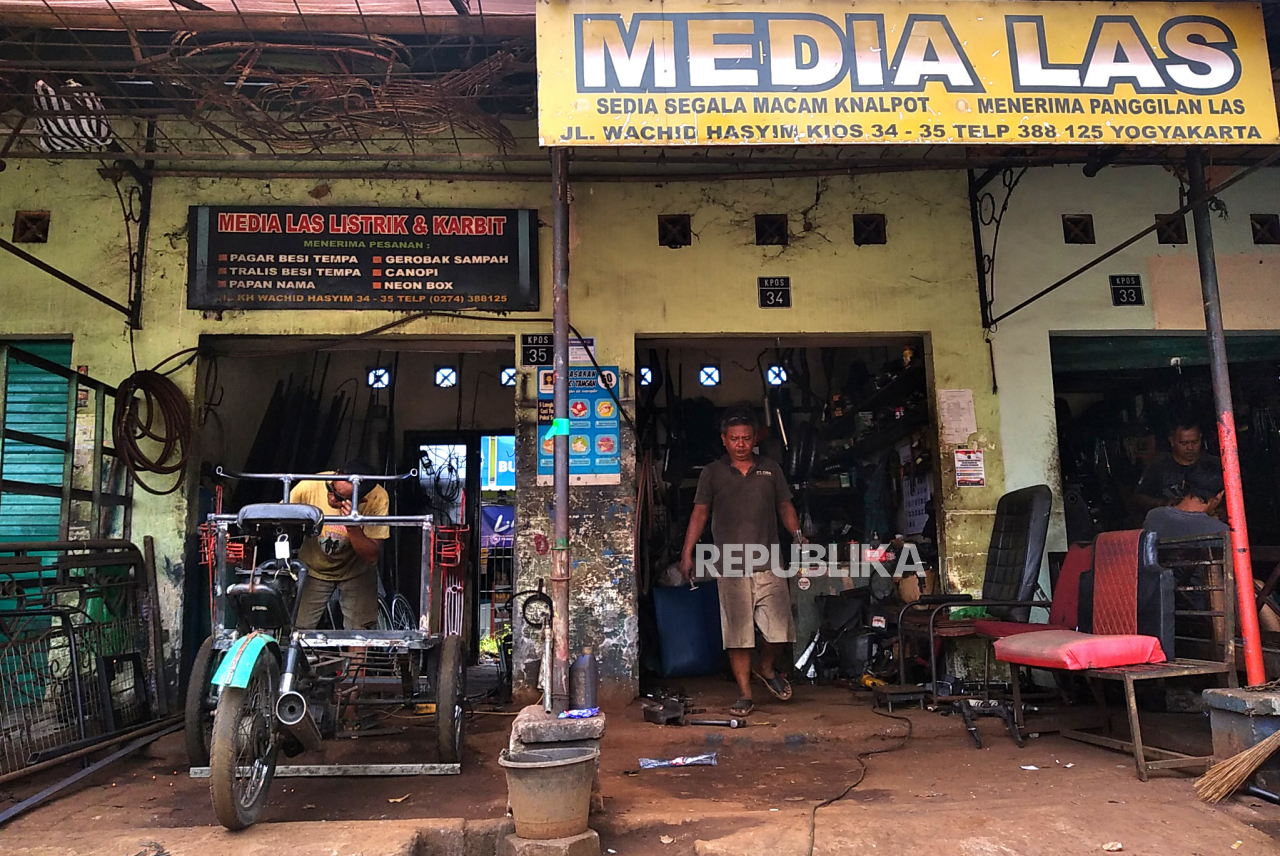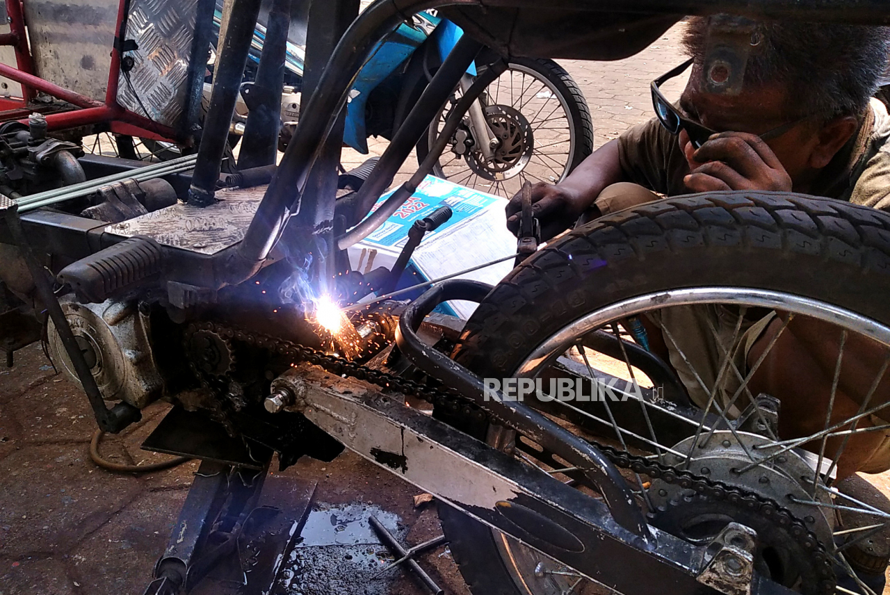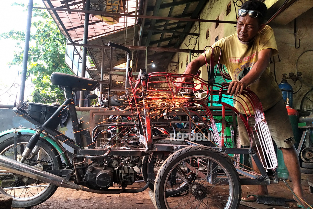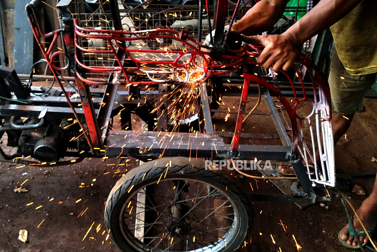 Tukang las membuat becak motor (Bentor) di kawasan Ngabean, Yogyakarta, Senin (16/1/2023). Aturan operasional bentor di Yogyakarta masih menjadi polemik. Namun, pesanan pembuatan Bentor cukup tinggi. Untuk satu unit Bentor dijual pada kisaran harga Rp 15 juta. Sedangkan untuk pembuatan memakan waktu tiga minggu untuk setiap bentor. Baca Selengkapnya';