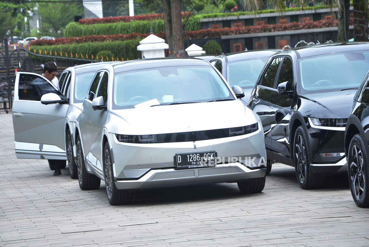 BANDUNG -- Puluhan mobil listrik merek Hyundai Ioniq 5 terparkir di halaman Gedung Sate, Jalan Diponegoro, Kota Bandung, Rabu (1/2/2023).