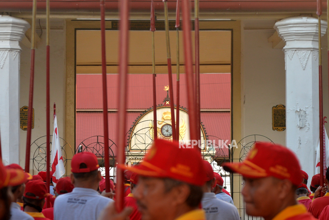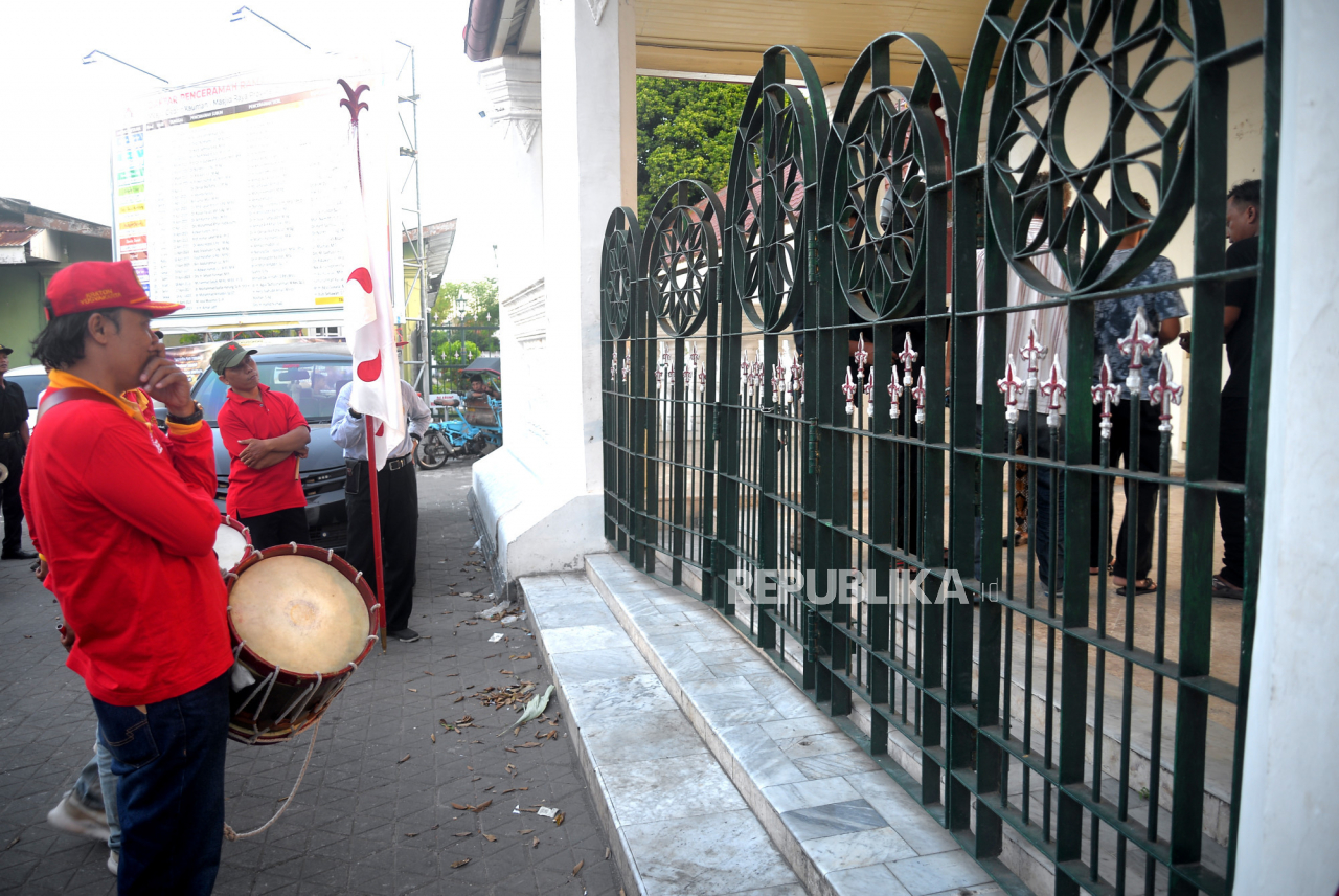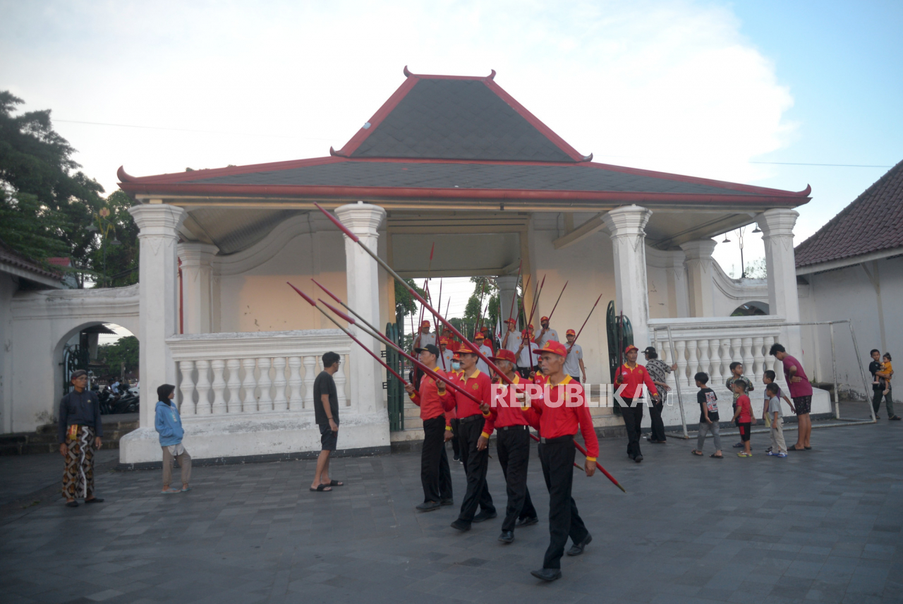 Bregada Prajurit Keraton Yogyakarta menunggu gerbang dibuka saat gladi bersih Grebeg Syawal di depan Masjid Gedhe Kauman, Yogyakarta, Rabu (19/4/2023). Grebeg Syawal nanti akan digelar pada Sabtu (22/4/2023) dengan mengarak tujuh gunungan dari Keraton Yog | Republika/Wihdan Hidayat
