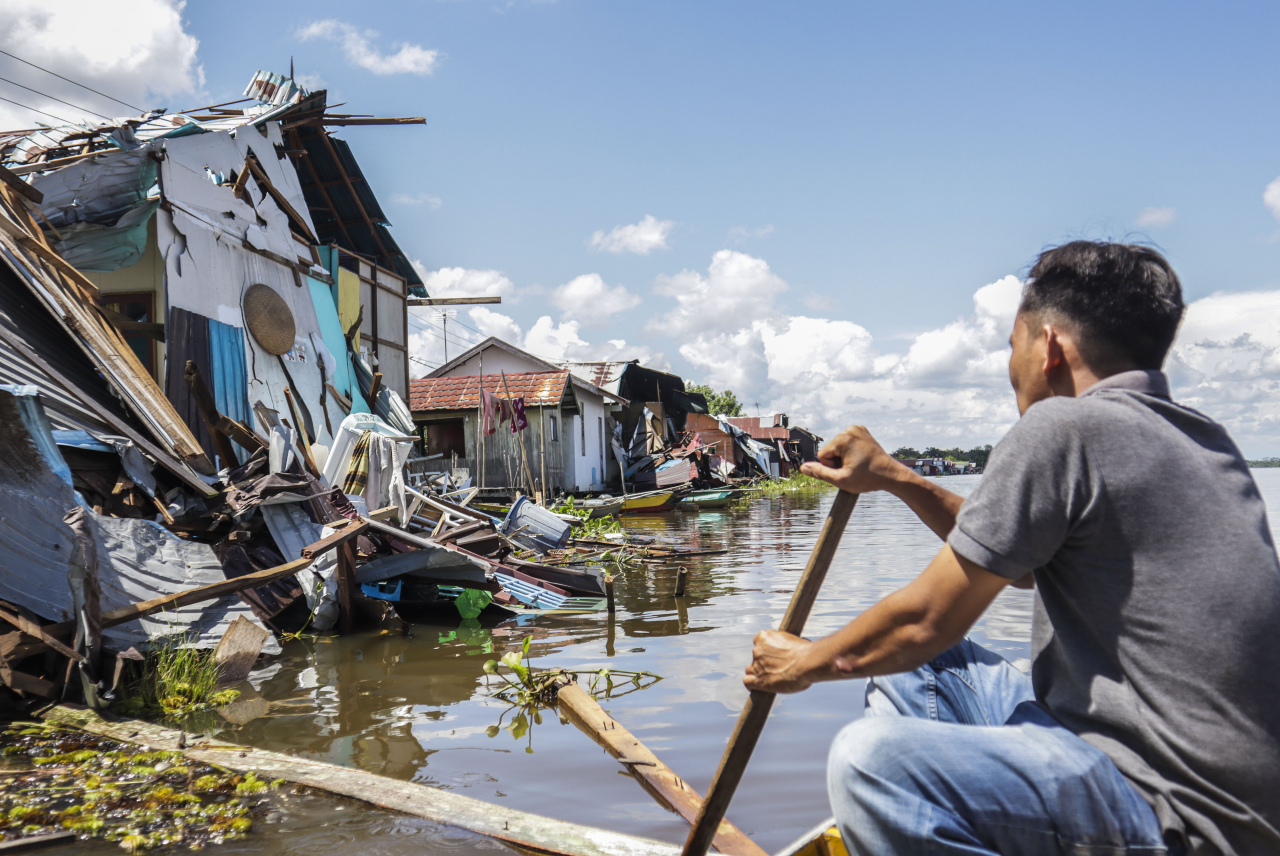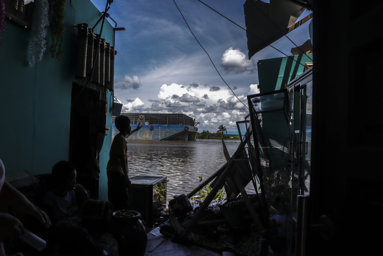 Kapal tongkang batu bara merusak 35 rumah, dan puluhan kendaraan air yang berlabuh di anak sungai Barito.