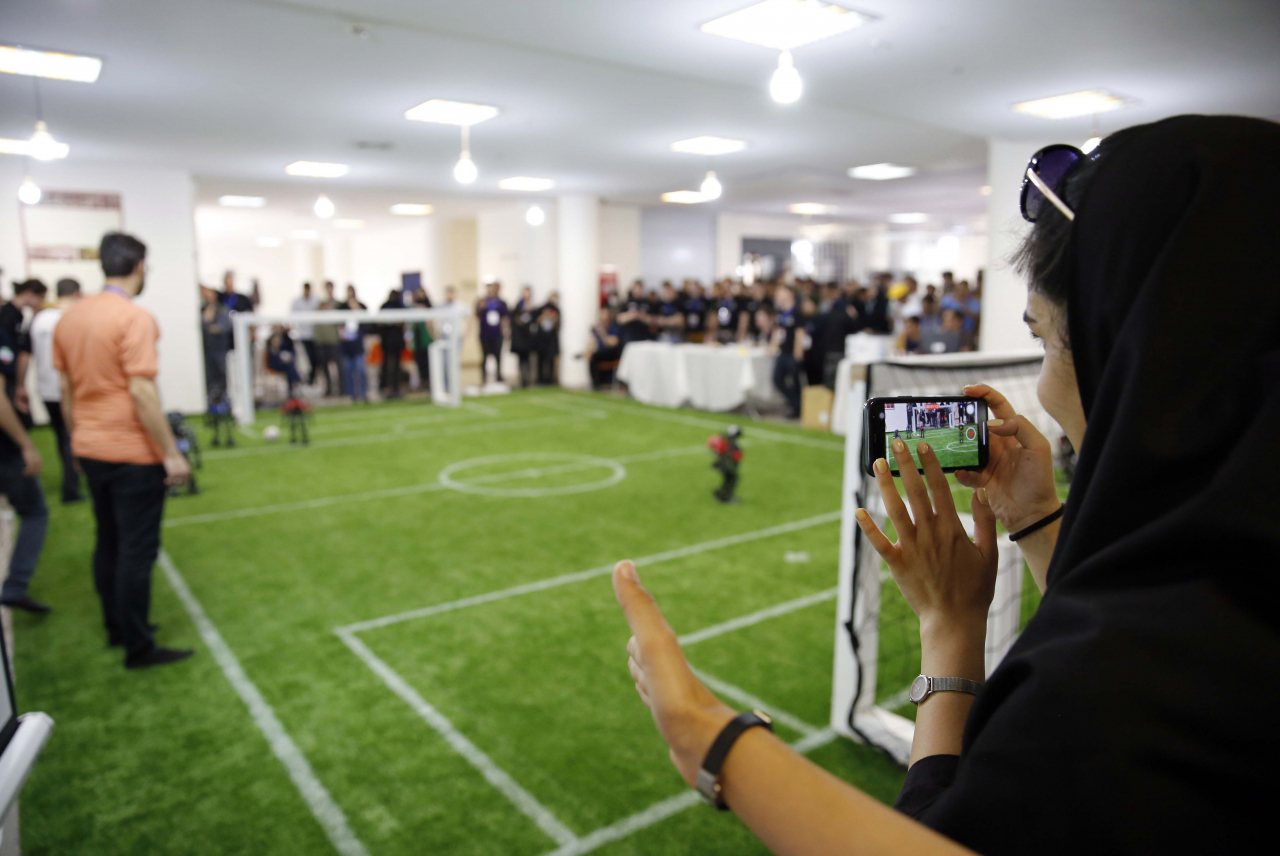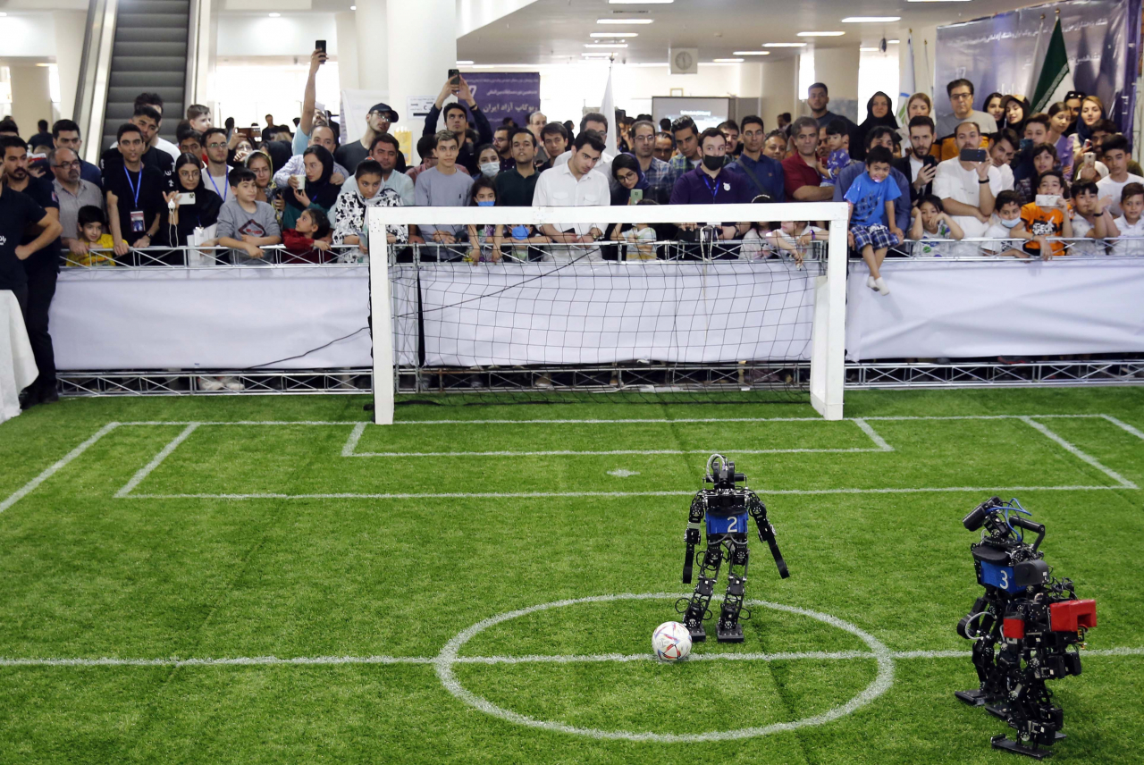 TEHERAN -- Laga sepakbola robot digelar di Teheran Iran, Kamis (17/4/2023). Pertandingan digelar dalam rangkaian acara 17th International Iran Open Robocup 2023 yang digelar di Islamic Azad University Science and Research Branch.