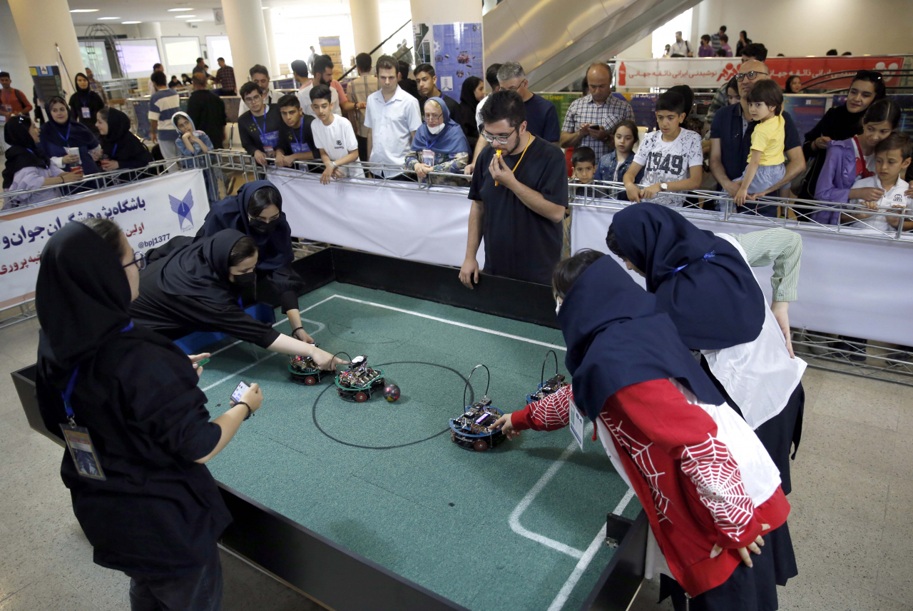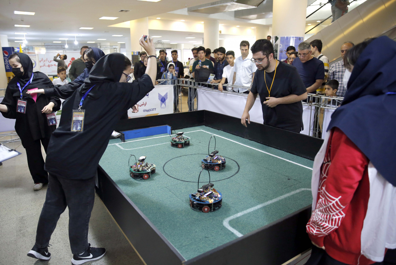 Mahasiswa Iran berpatisipaso pada laga sepakbola robot antara tim sepakbola Iran MRL team (merah) dan Russia Starkit team (biru) pada acara17th International Iran Open Robocup 2023 yang digelar di Teheran Iran, Kamis (17/4/2023). Pertandingan ini diadak | EPA-EFE/ABEDIN TAHERKENAREH