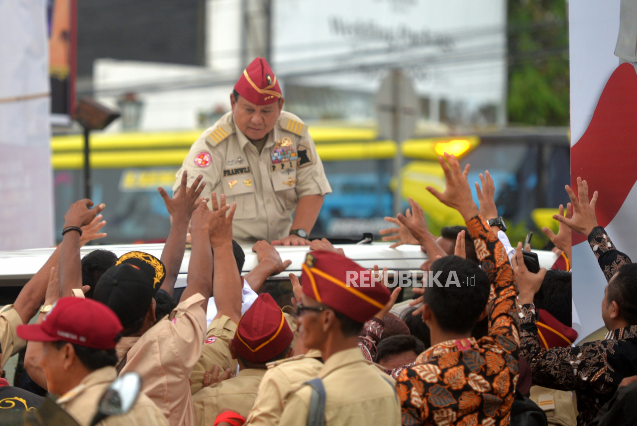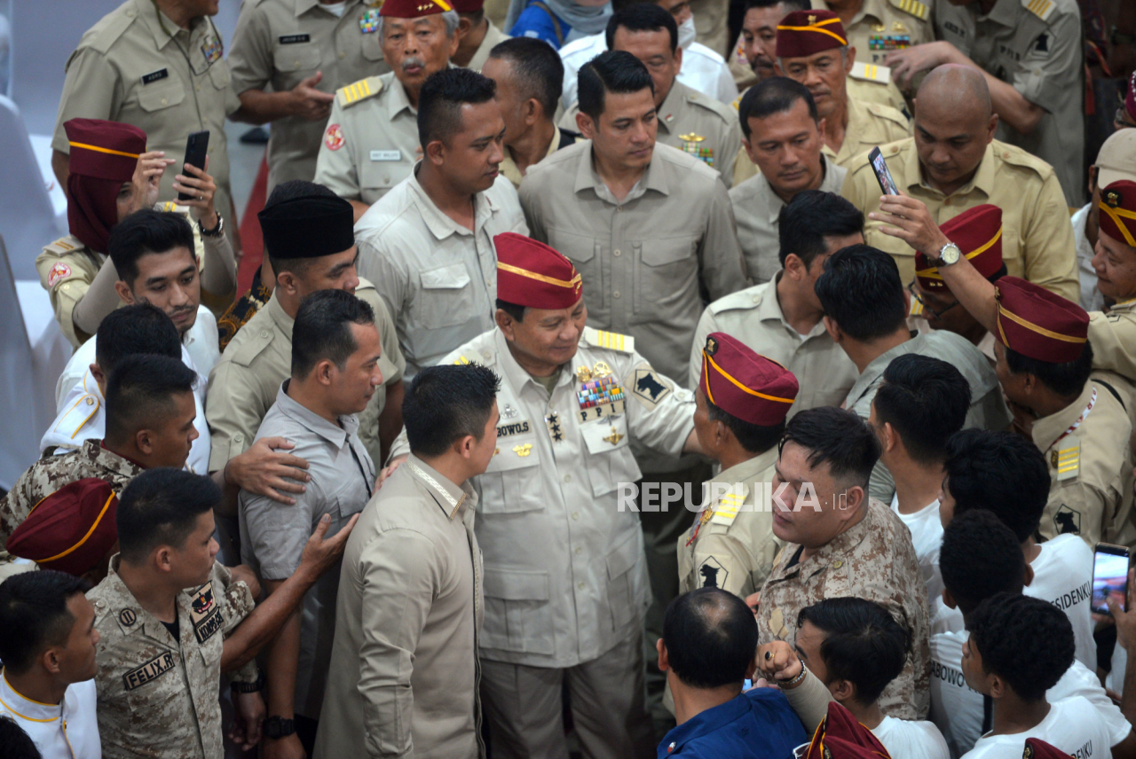Menteri Pertahanan, Prabowo Subianto menyapa para purnawirawan saat menghadiri reuni akbar dan halal bihalal bersama Purnawarman TNI dan Polri di Jogja Expo Center, Yogyakarta, Rabu (3/5/2023). | Republika/Wihdan Hidayat