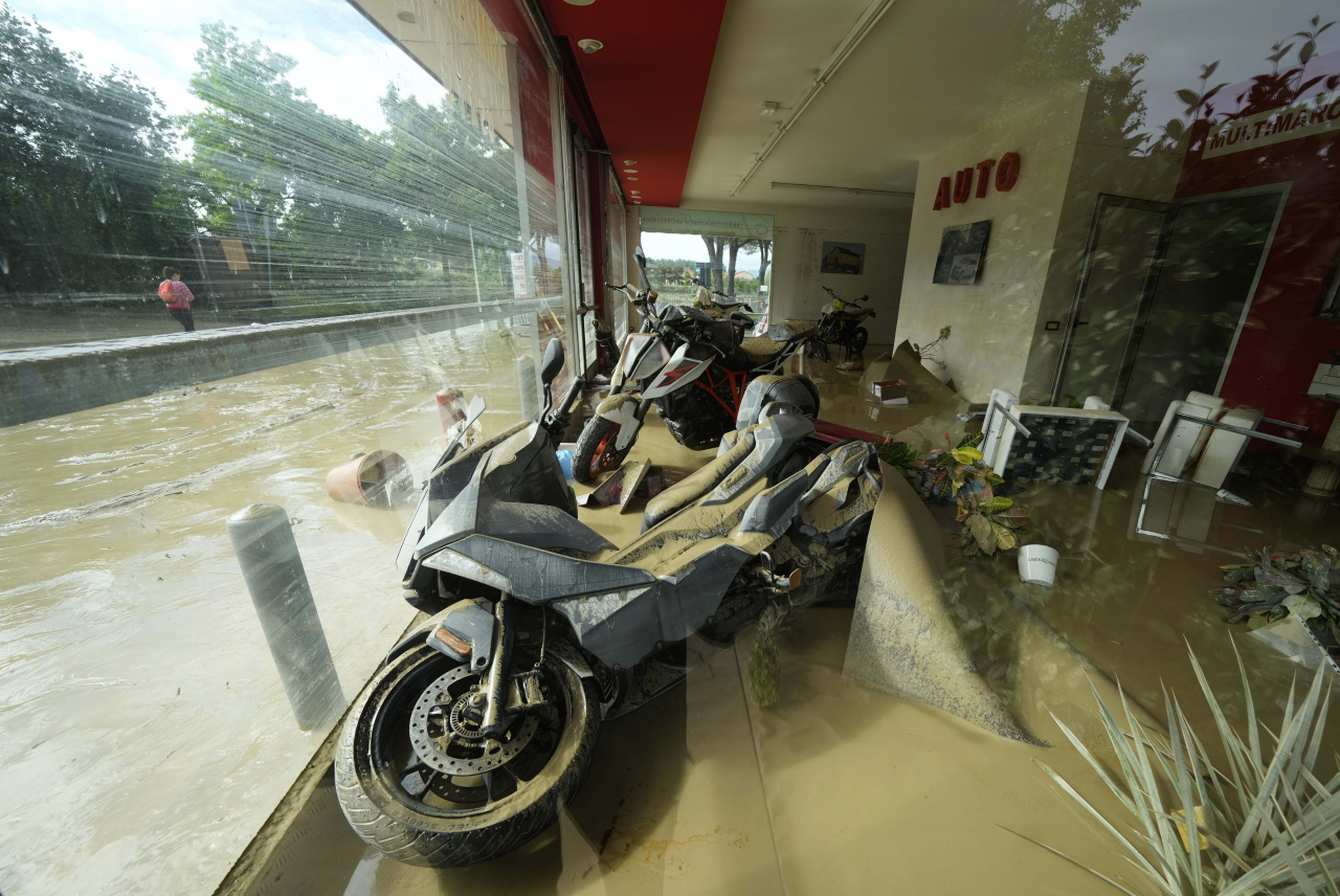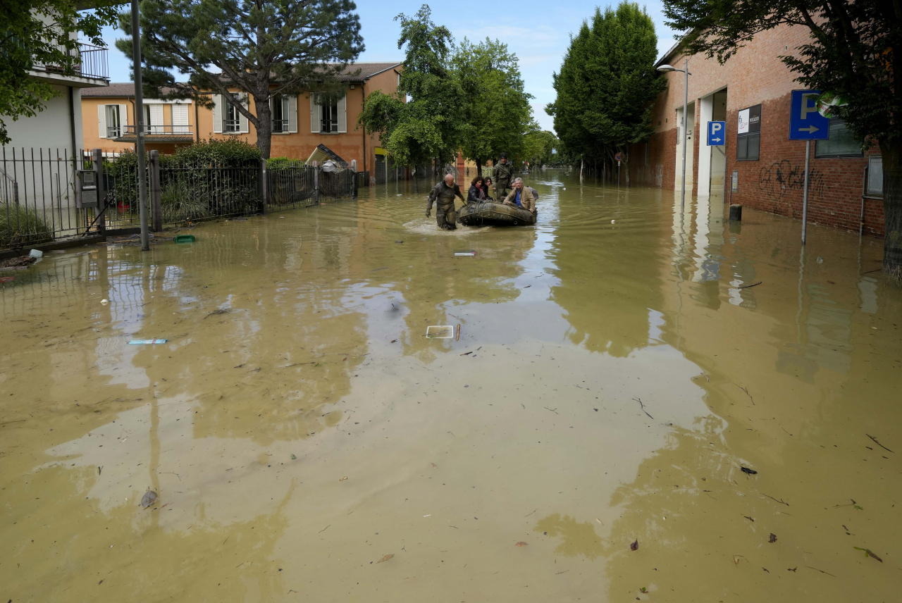 Air berlumpur mengalir melalui jalan-jalan di Faenza, Cesena, dan Forli, tepat di sebelah selatan Imola, membasahi atap-atap mobil yang diparkir, menenggelamkan beberapa toko dan memaksa penduduk setempat mengungsi ke lantai atas rumah mereka.