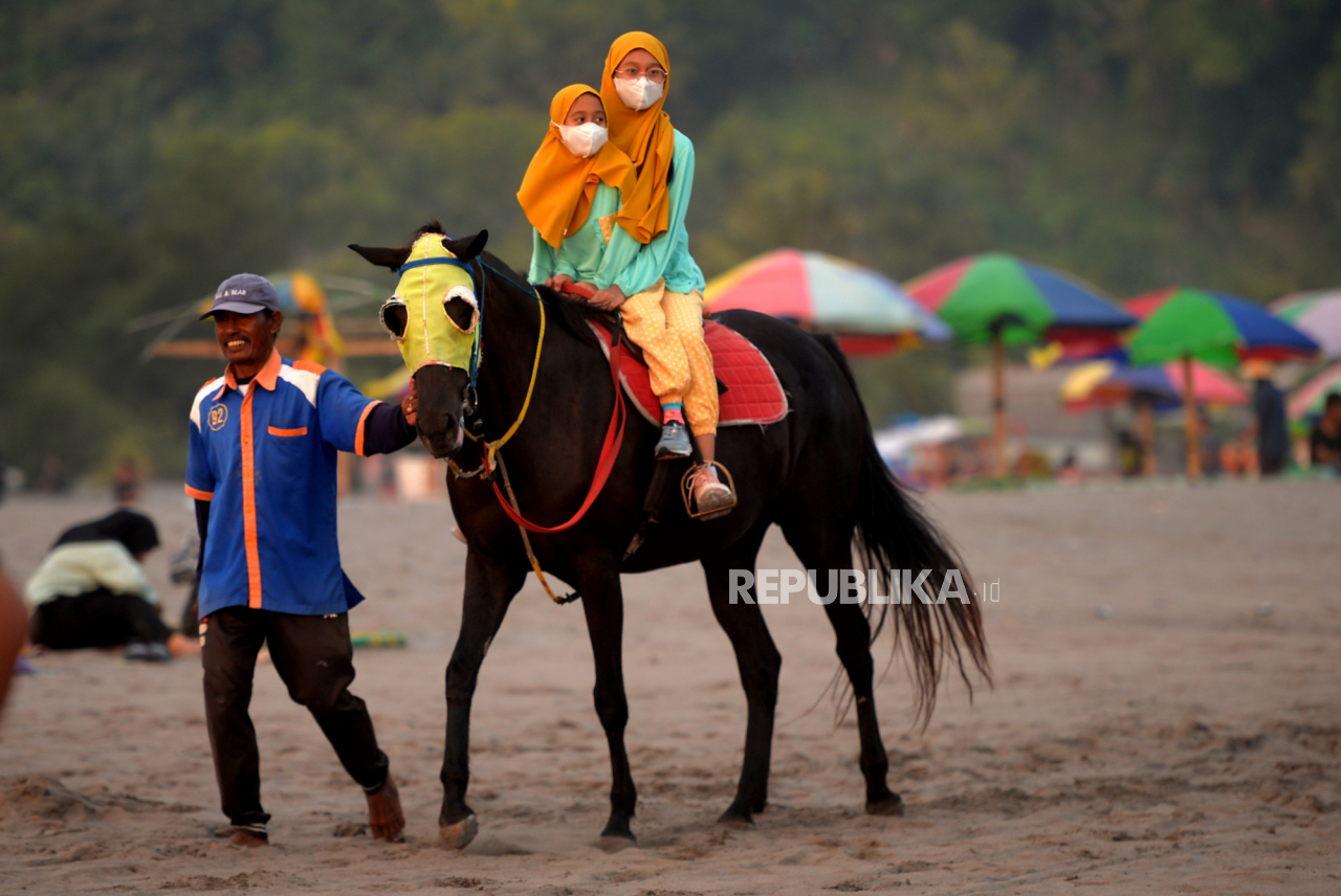 Wisatawan menyewa kuda wisata di Pantai Parangtritis, Bantul, Yogyakarta, Kamis (1/6/2023). | Republika/Wihdan Hidayat