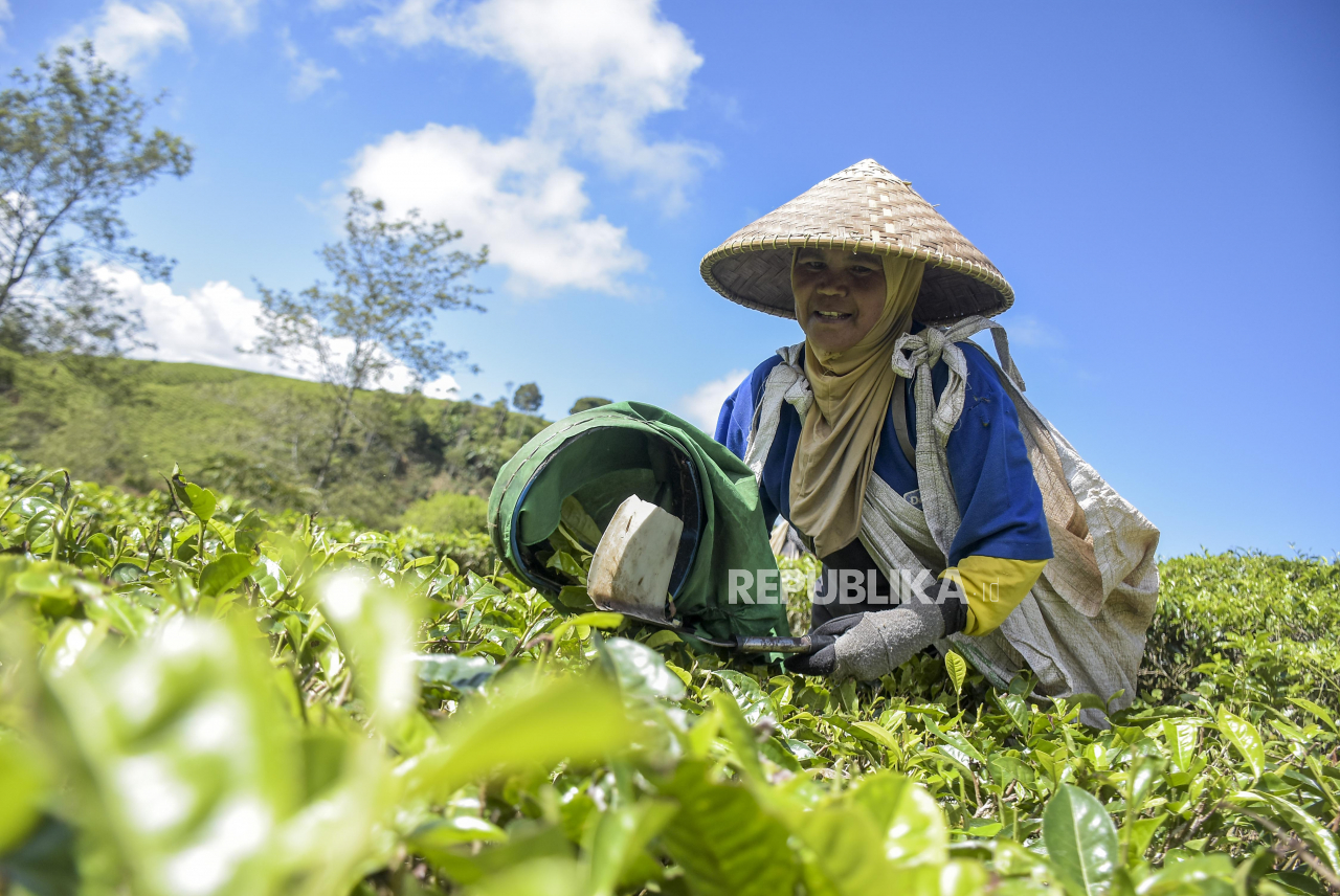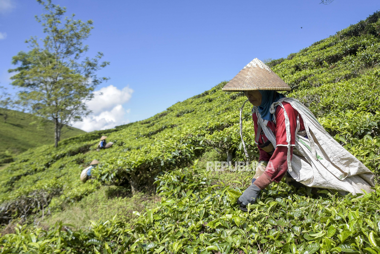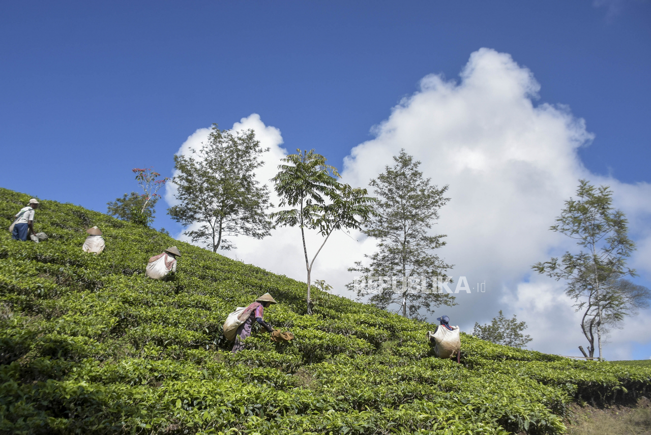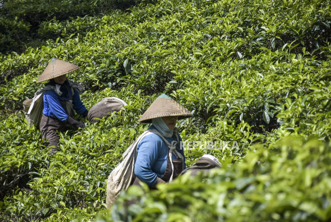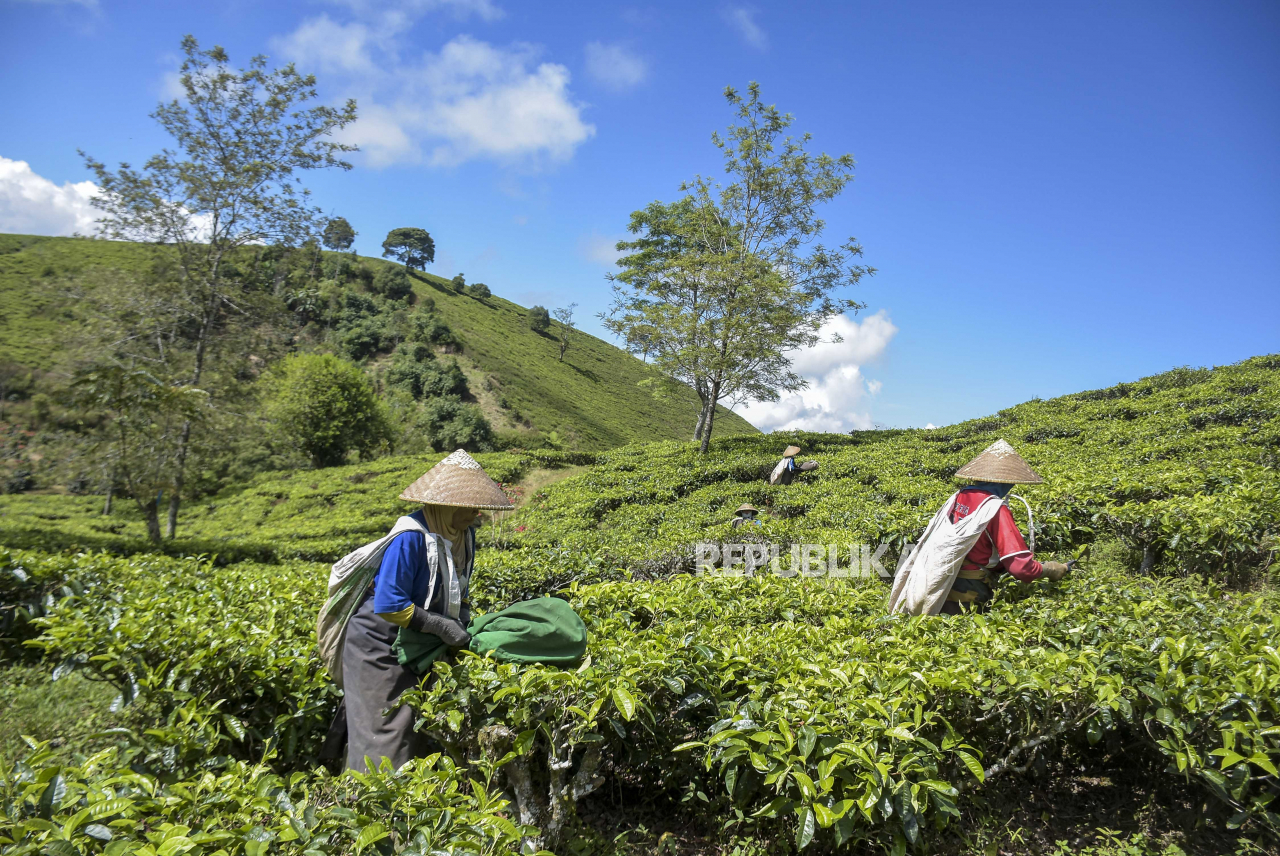 BANDUNG -- Buruh memetik daun teh di area perkebunan teh di Pangalengan, Kabupaten Bandung, Sabtu (24/6/2023). Badan Pusat Statistik (BPS) mencatat, Provinsi Jawa Barat menjadi provinsi dengan produksi teh terbesar di Indonesia pada tahun 2022 dengan jumlah produksi mencapai 91.600 ton.