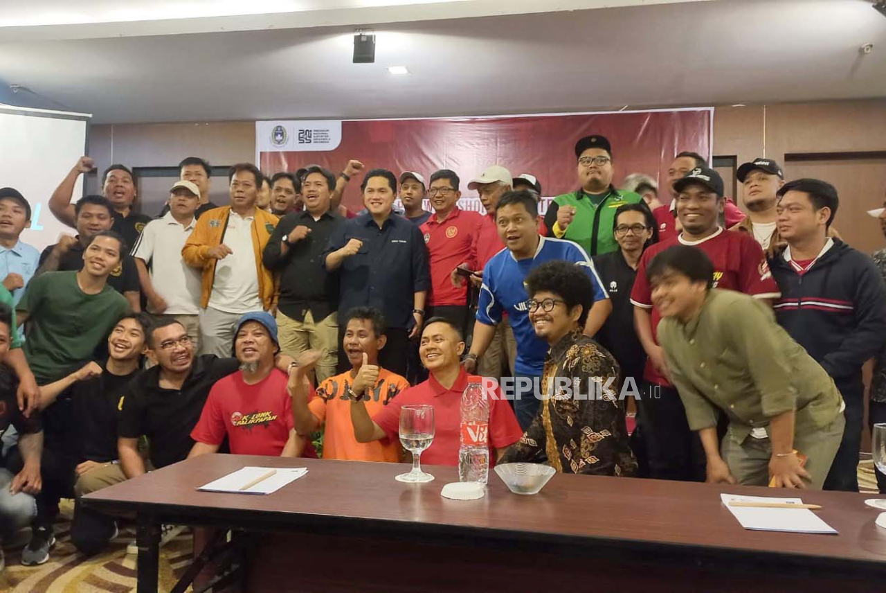 Ketua Umum PSSI Erick Thohir bersama pimpinan suporter dalam acara pra workshop suporter sepak bola nasional di Daerah Istimewa Yogyakarta (DIY), Jumat (15/9/2023). | Republika/ Muhammad Nursyamsi