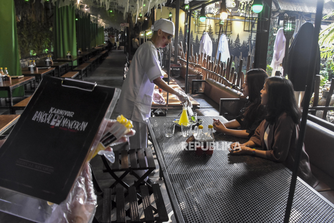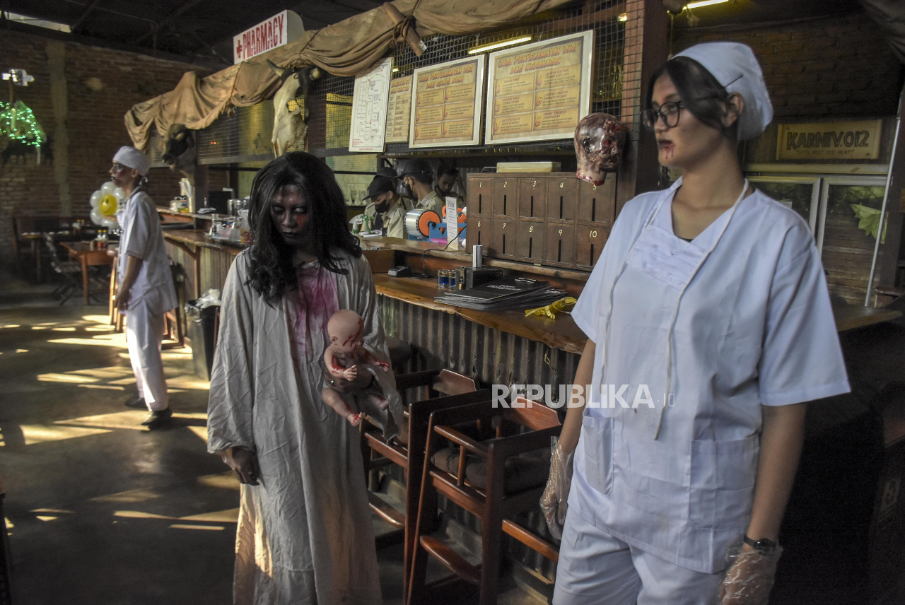 Pramusaji mengenakan kostum bertema tenaga medis melayani pengunjung di Karnivor, Kota Bandung, Jawa Barat, Senin (9/10/2023). Restoran tersebut menyajikan menu makanan, minuman dan wahana uji nyali, serta ornamen nuansa halloween bertajuk Ruang Lain Jili | ABDAN SYAKURA/REPUBLIKA