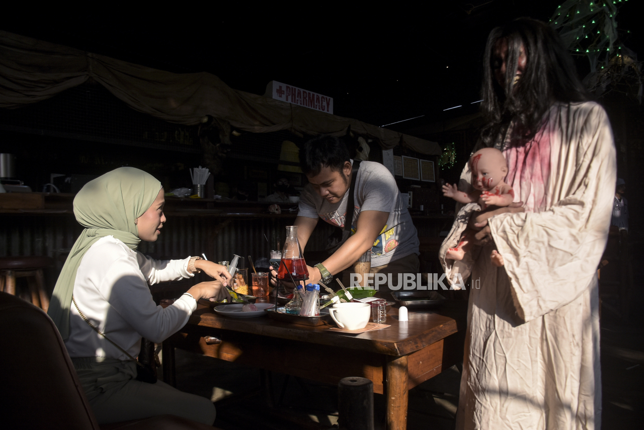 Pengunjung menikmati makanan minuman bersama Pocong di area wahana uji nyali Bangsal Mencekam di Karnivor, Kota Bandung, Jawa Barat, Senin (9/10/2023). | ABDAN SYAKURA/REPUBLIKA