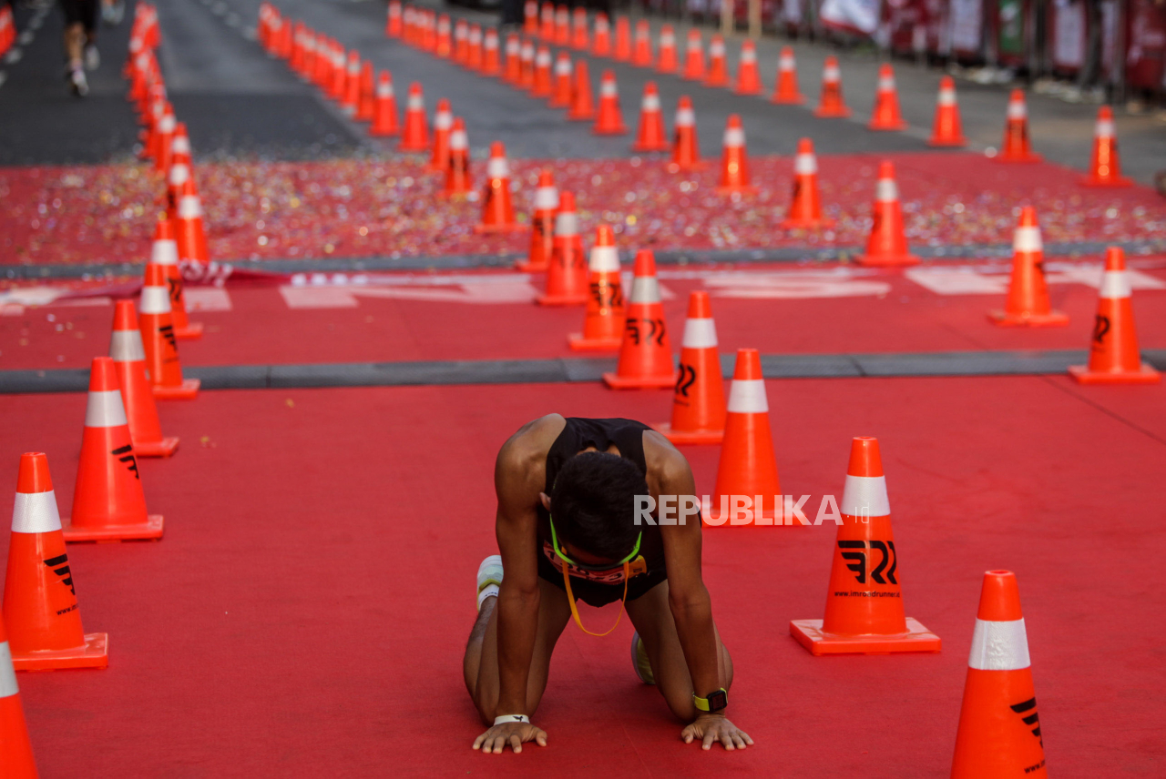 Peserta berlutut kelelahan setibanya di garis finish saat mengikuti BTN Jakarta Run 2023 di Jalan Medan Merdeka Selatan, Jakarta, Ahad (12/11/2023). | Republika/Putra M. Akbar