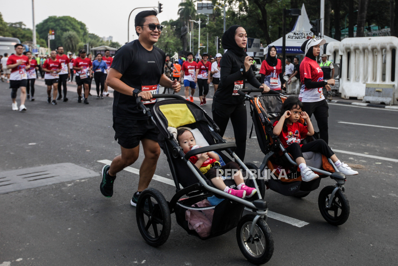 Peserta mendorong kereta bayi saat mengikuti BTN Jakarta Run 2023 di Jalan MH Thamrin, Jakarta, Ahad (12/11/2023). | Republika/Putra M. Akbar