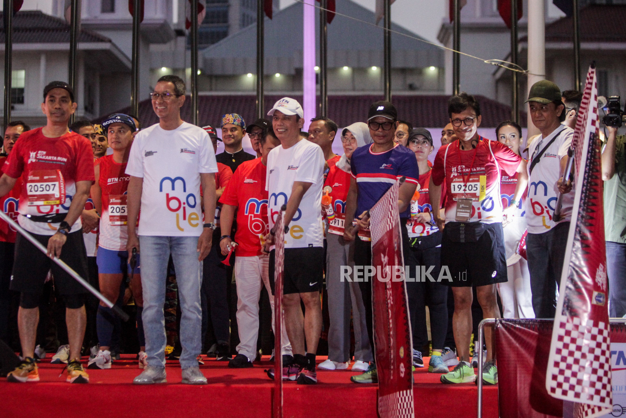 Direktur Utama BTN Nixon LP Napitupulu (ketiga kiri), Pj Gubernur DKI Jakarta Heru Budi Hartono (kedua kiri) dan Wakil Menteri Luar Negeri Pahala Mansury (ketiga kanan) bersiap melepas peserta BTN Jakarta Run 2023 di Jalan Medan Merdeka Selatan, Jakarta, | Republika/Putra M. Akbar