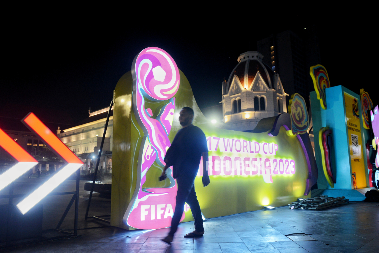 Warga berjalan melintas didepan papan bergambar Piala Dunia U17 yang dipajang di halaman Balai Pemuda, Surabaya, Jawa Timur, Selasa (14/11/2023). Sejumlah ornamen yangPiala dunia U17 menghiasi sejumlah kawasan di surabaya, salah satunya di area Balai Kota | Republika/Thoudy Badai