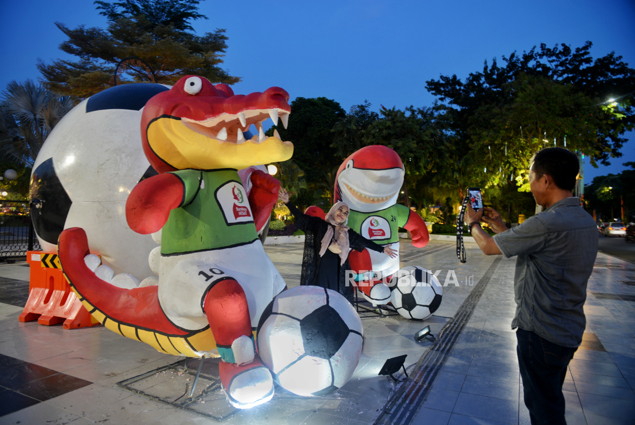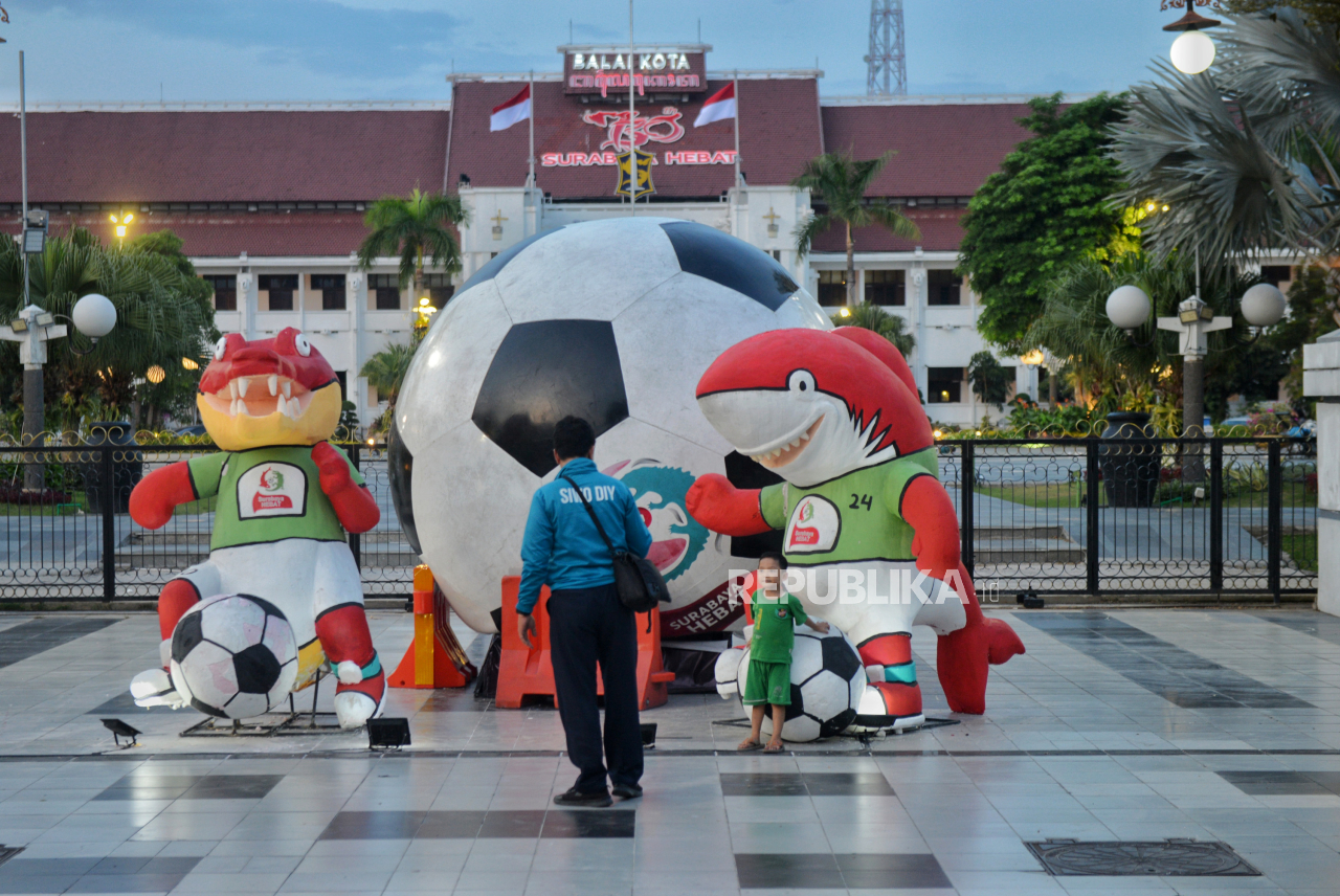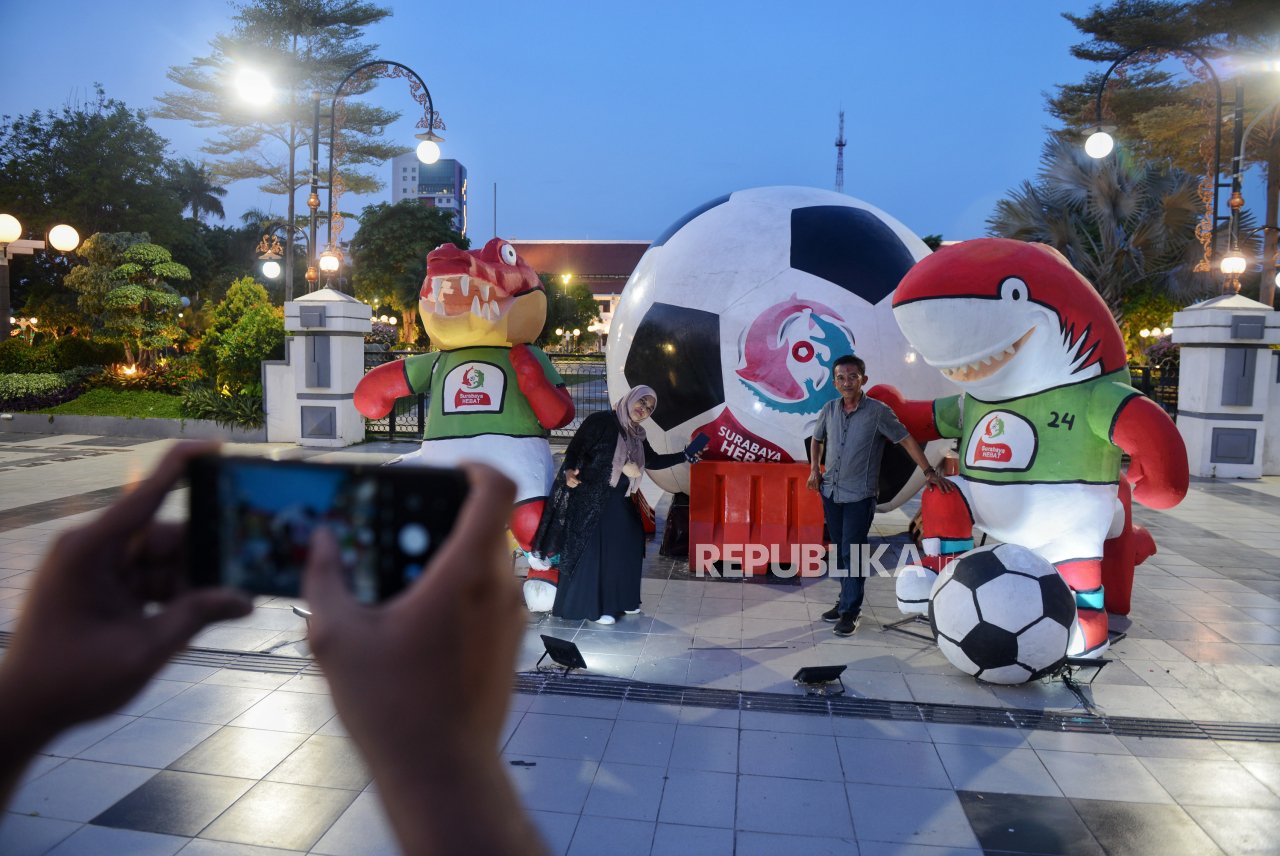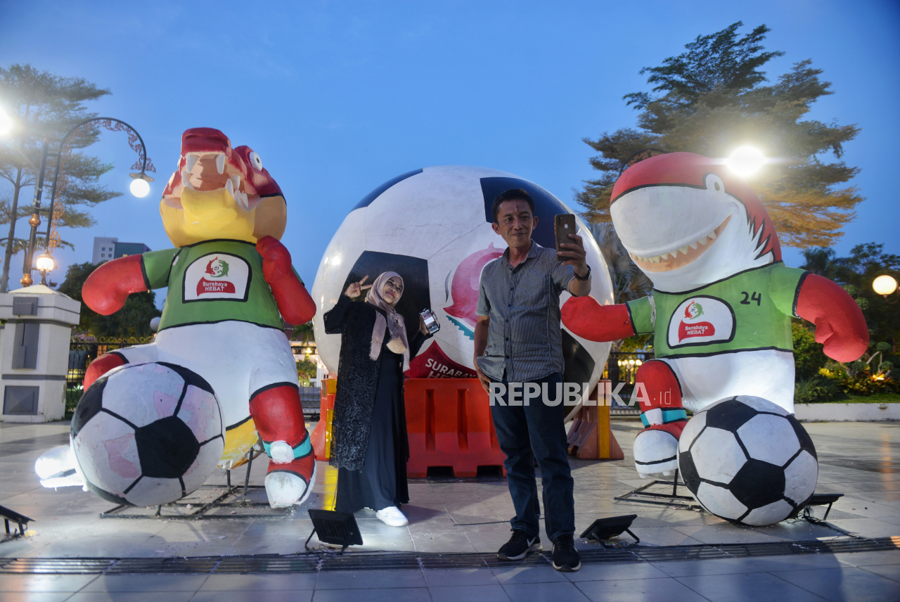 SURABAYA -- Warga berfoto dengan maskot Piala Dunia U17 yang dipajang di halaman Balai Kota Surabaya, Jawa Timur, Selasa (14/11/2023). Sejumlah ornamen yang Piala dunia U17 menghiasi sejumlah kawasan di surabaya, salah satunya di area Balai Kota, Balai Pemuda, serta spanduk umbul-umbul di sepanjang Jalan Gubernur Suryo. Baca Selengkapnya';