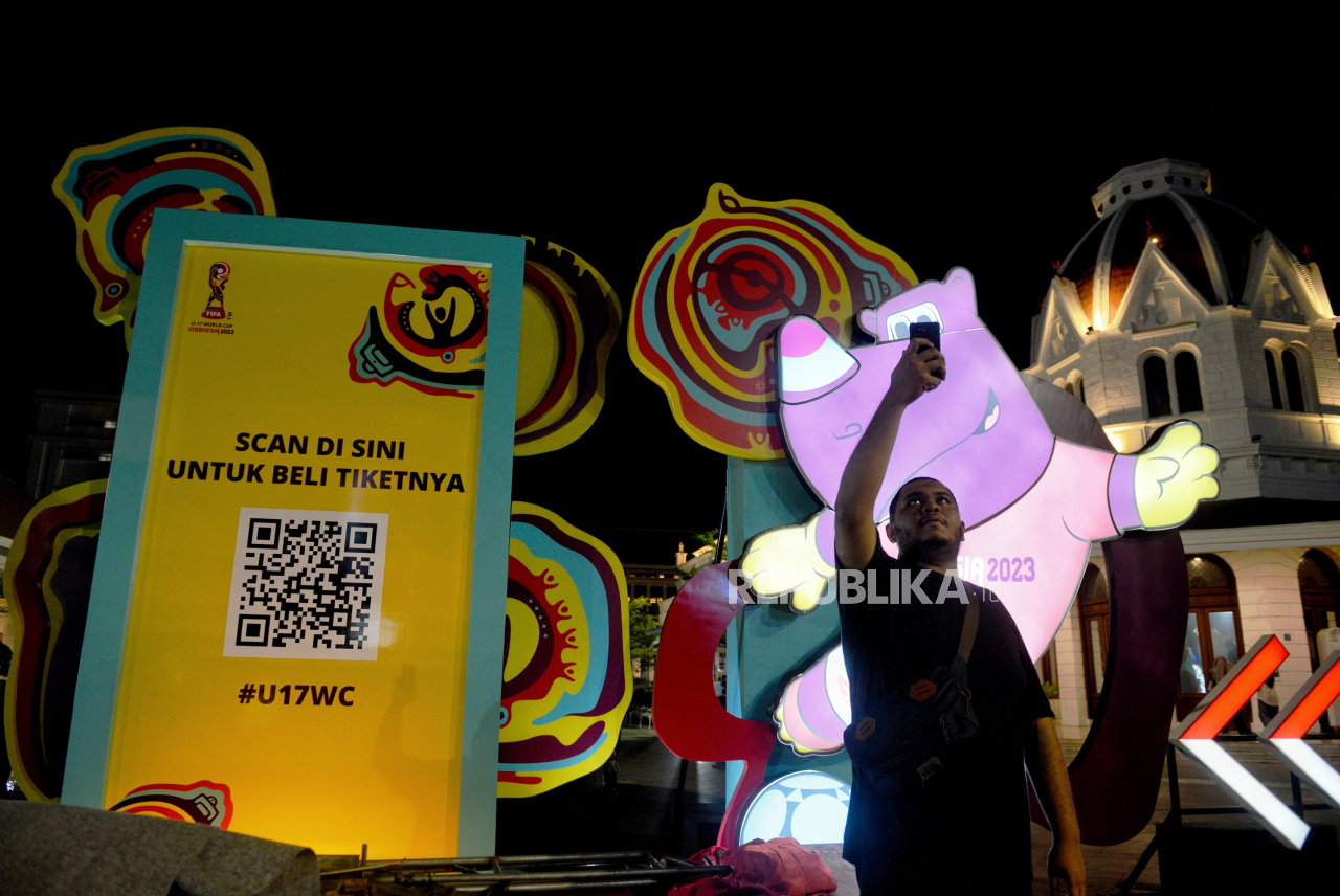 Warga berfoto dengan maskot Piala Dunia U17 yang dipajang di halaman Balai Pemuda, Surabaya, Jawa Timur, Selasa (14/11/2023). | Republika/Thoudy Badai