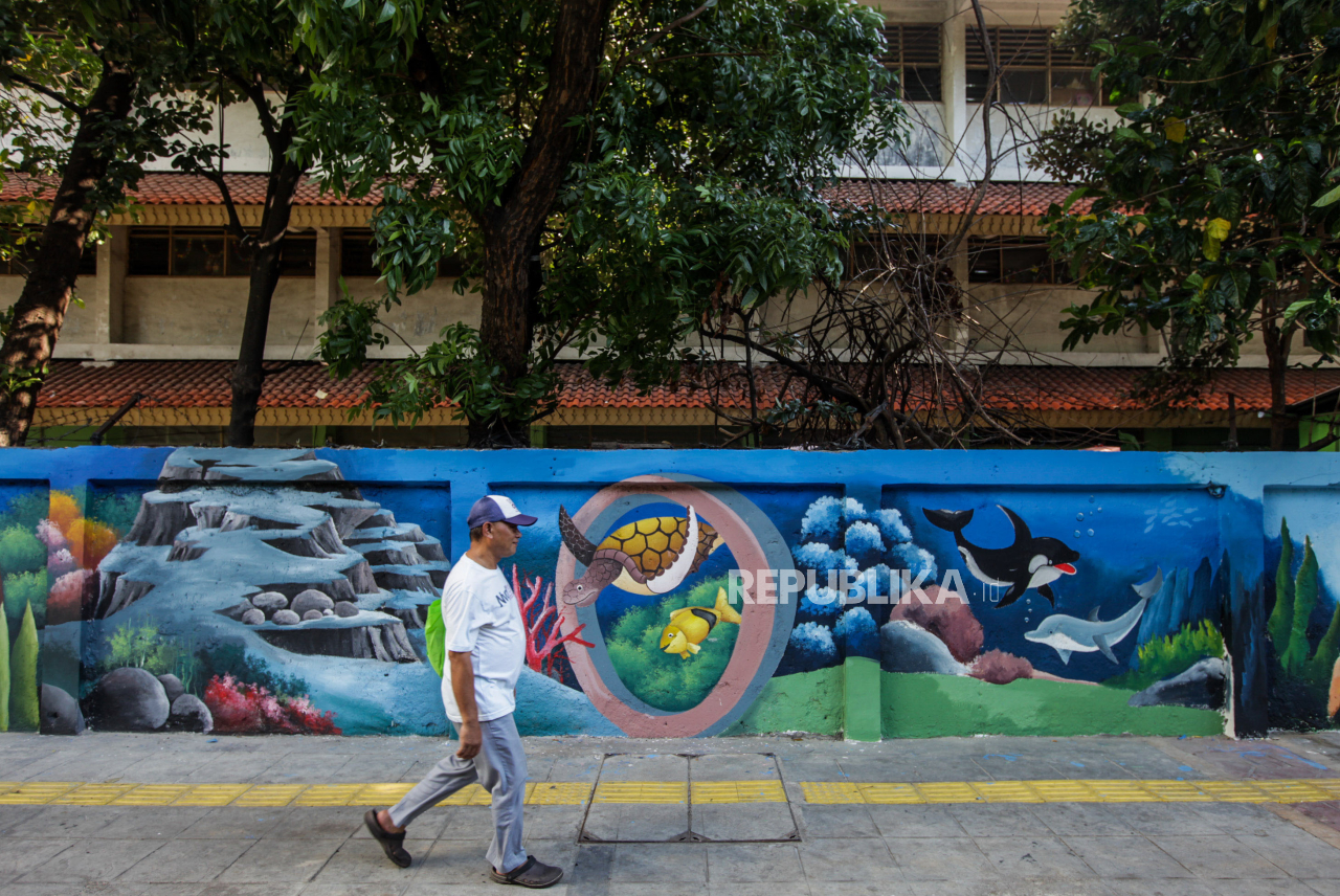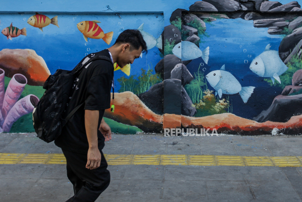 Mural sepanjang 80 meter bertemakan biota laut dengan gambar berbagai macam makhluk hidup laut mulai dari ikan, kura-kura dan terumbu karang tersebut untuk menimbulkan kesan hidup lebih dekat dengan a | Republika/Putra M. Akbar