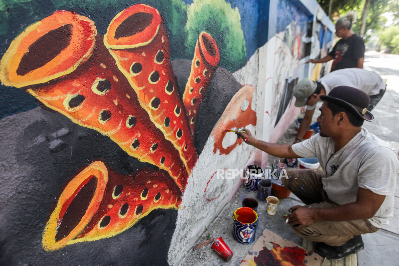 Seniman dari Sanggar Garis Biru melukis mural di Jalan Siantar, Cideng, Jakarta Pusat, Rabu (29/11/2023). Mural sepanjang 80 meter bertemakan biota laut dengan gambar berbagai macam makhluk hidup laut mulai dari ikan, kura-kura dan terumbu karang tersebut | Republika/Putra M. Akbar