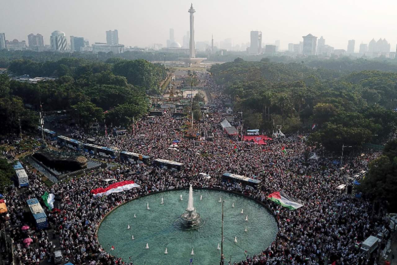 Ketua Pelaksana Aksi Indonesia Lawan Genosida Dukung Palestina Merdeka, Namsianto Wakhid mengatakan bahwa lebih dari 10.000 massa aksi Indonesia Lawan Genosida Dukung Palestina Merdeka berkumpul di Silangan Monas dekat Patung Kuda. Massa bukan hanya dari Jakarta tapi dari luar daerah juga, ada sekitar 250 bus dari berbagai daerah di Jawa dan Sumatera.